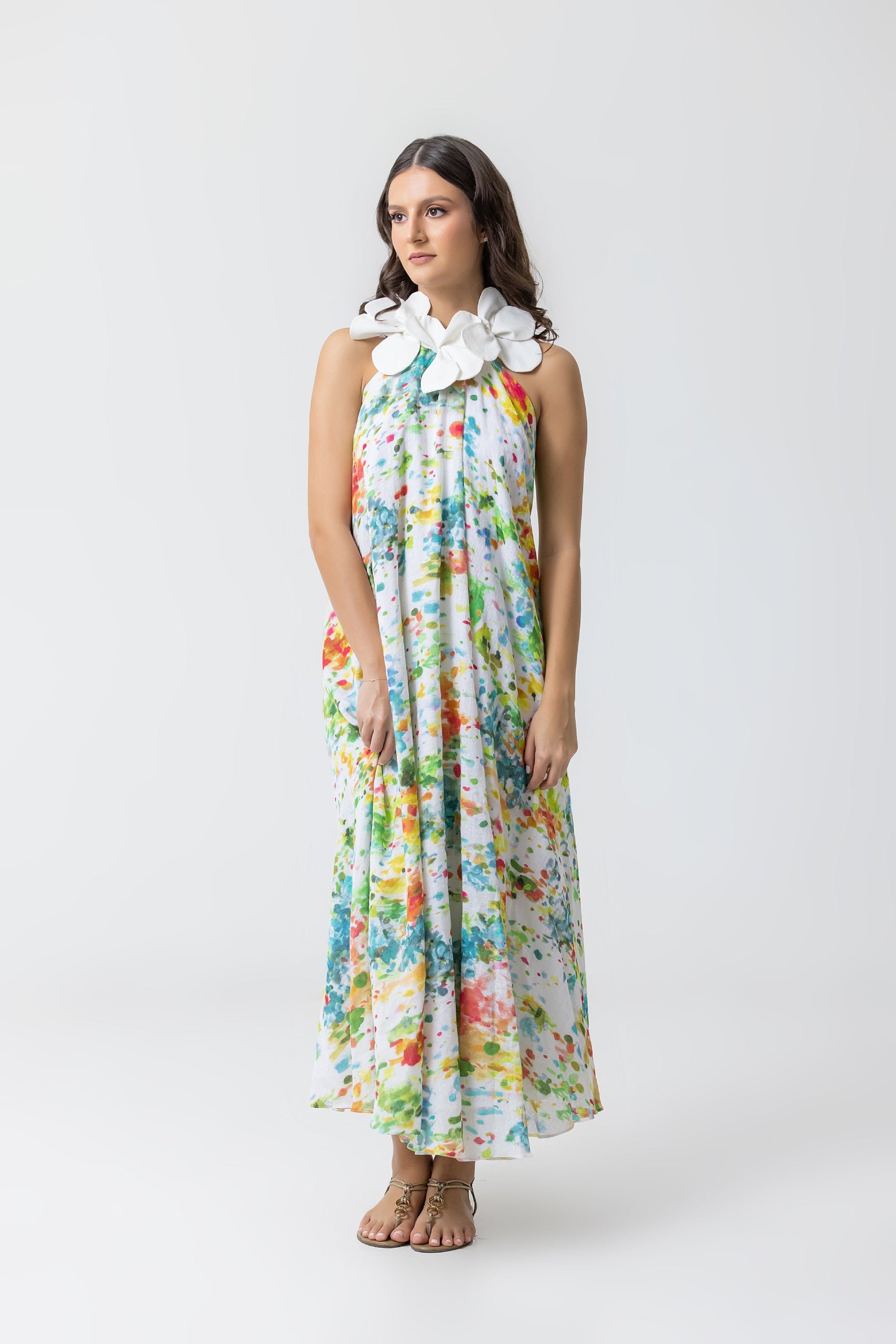 Maxi dress halter tipo slip on. Aplique de flores en el cuello con botones atras en el cuello. Espalda baja. Cinturón con flecos con un print tribal y flecos.