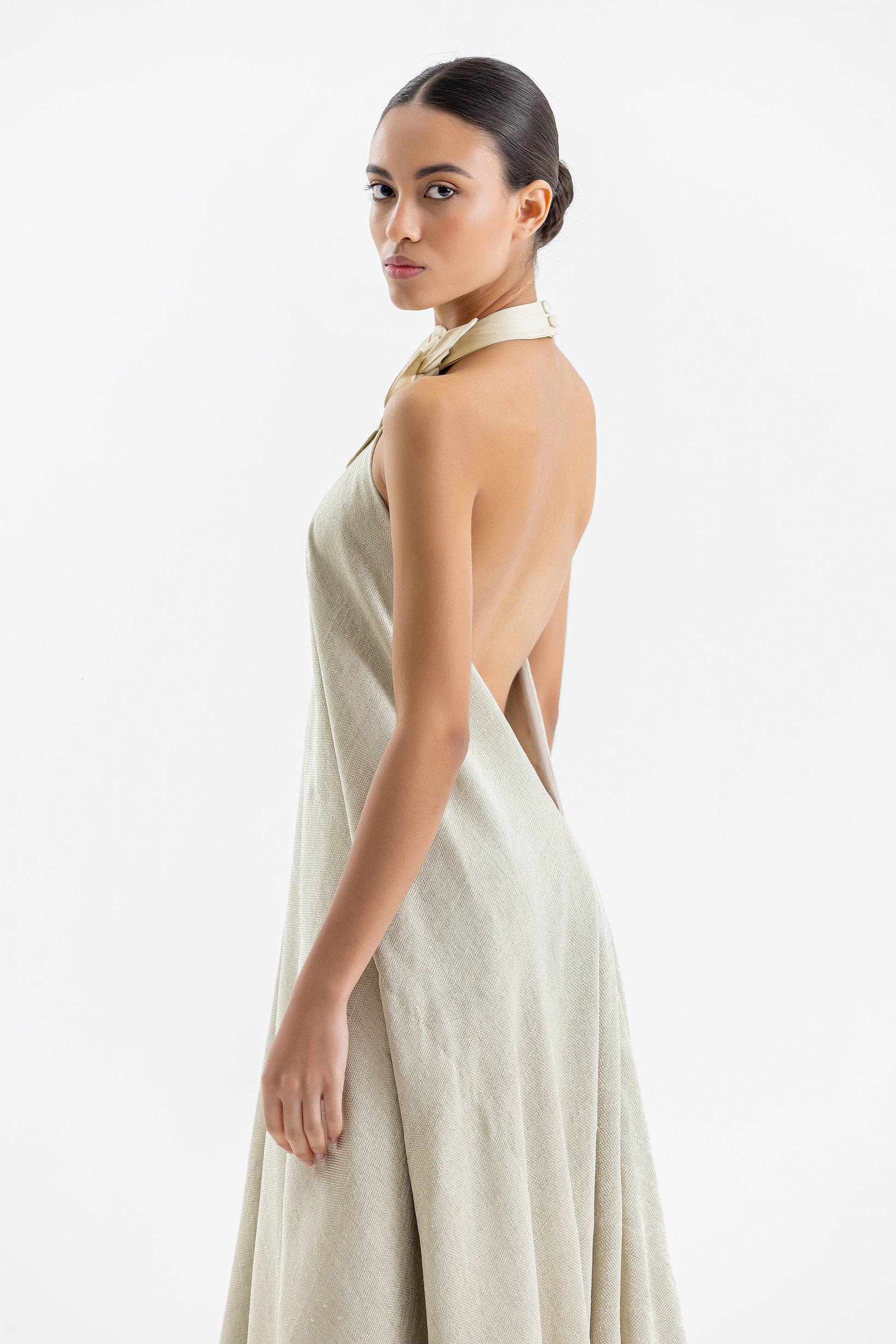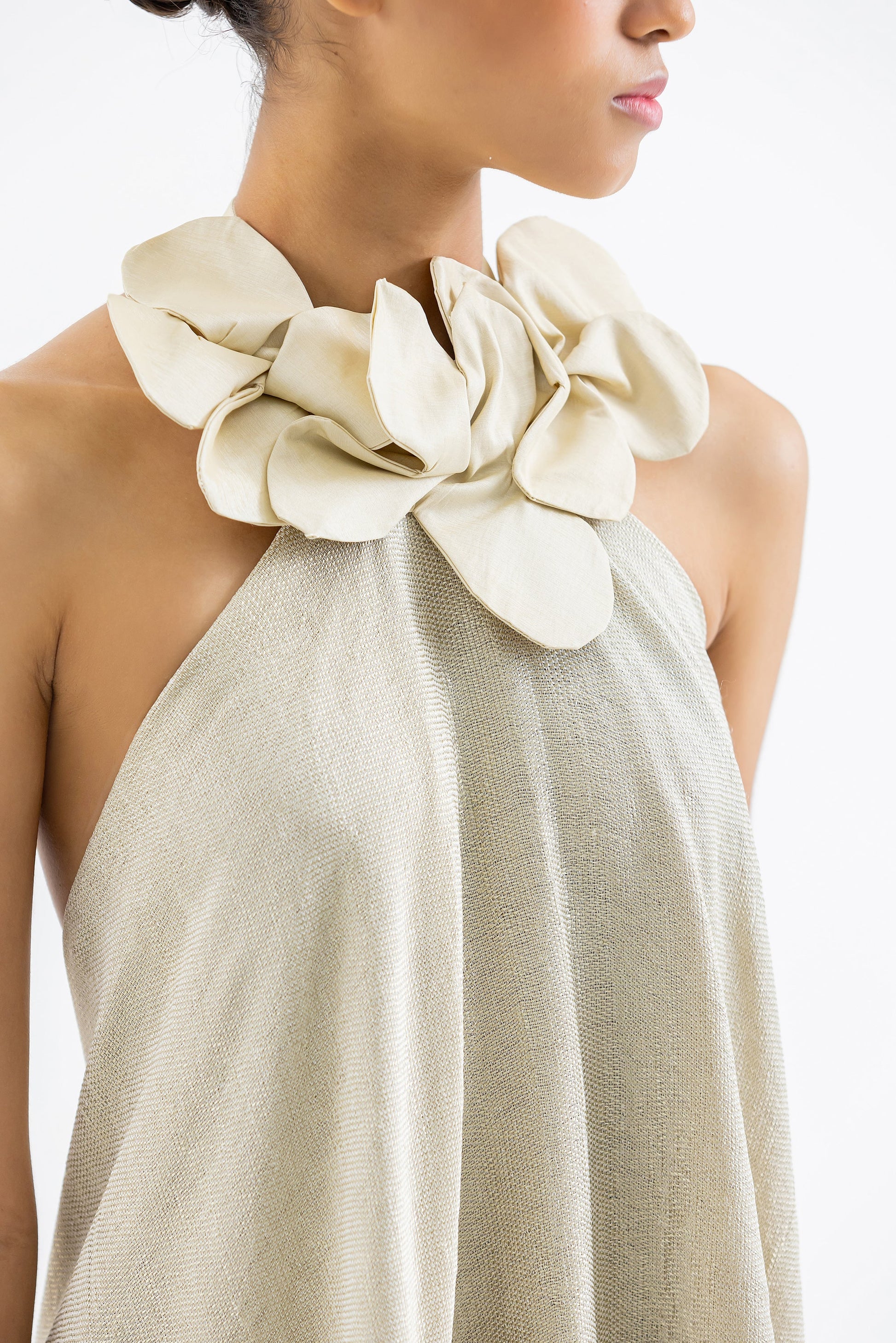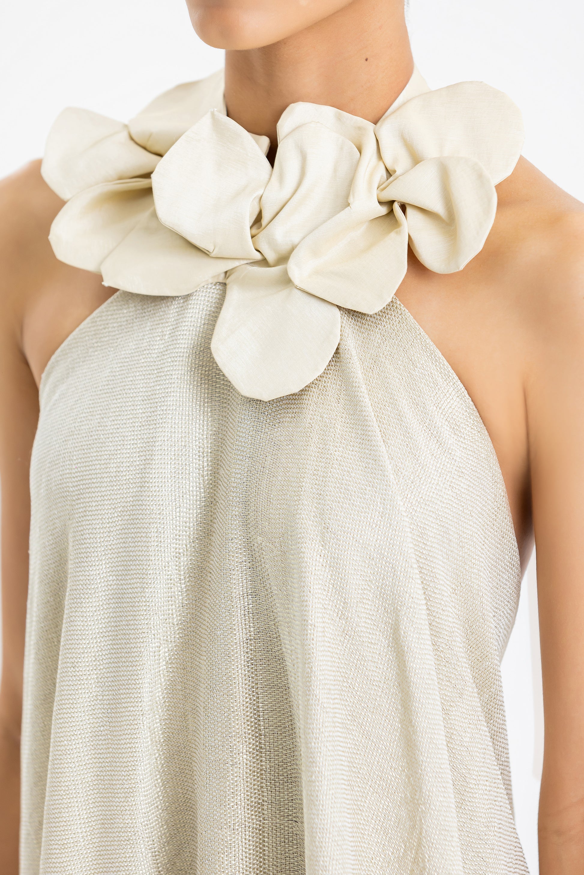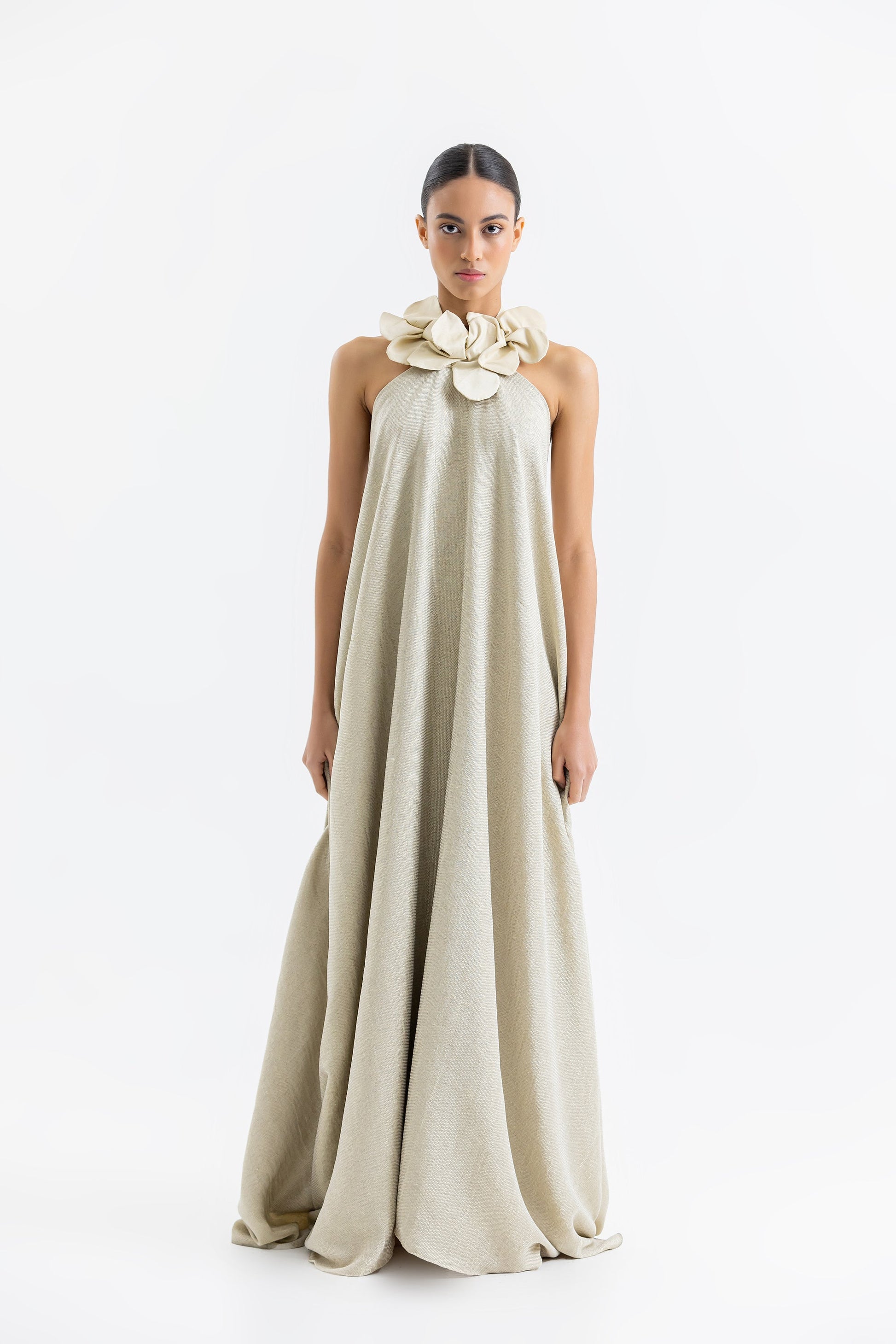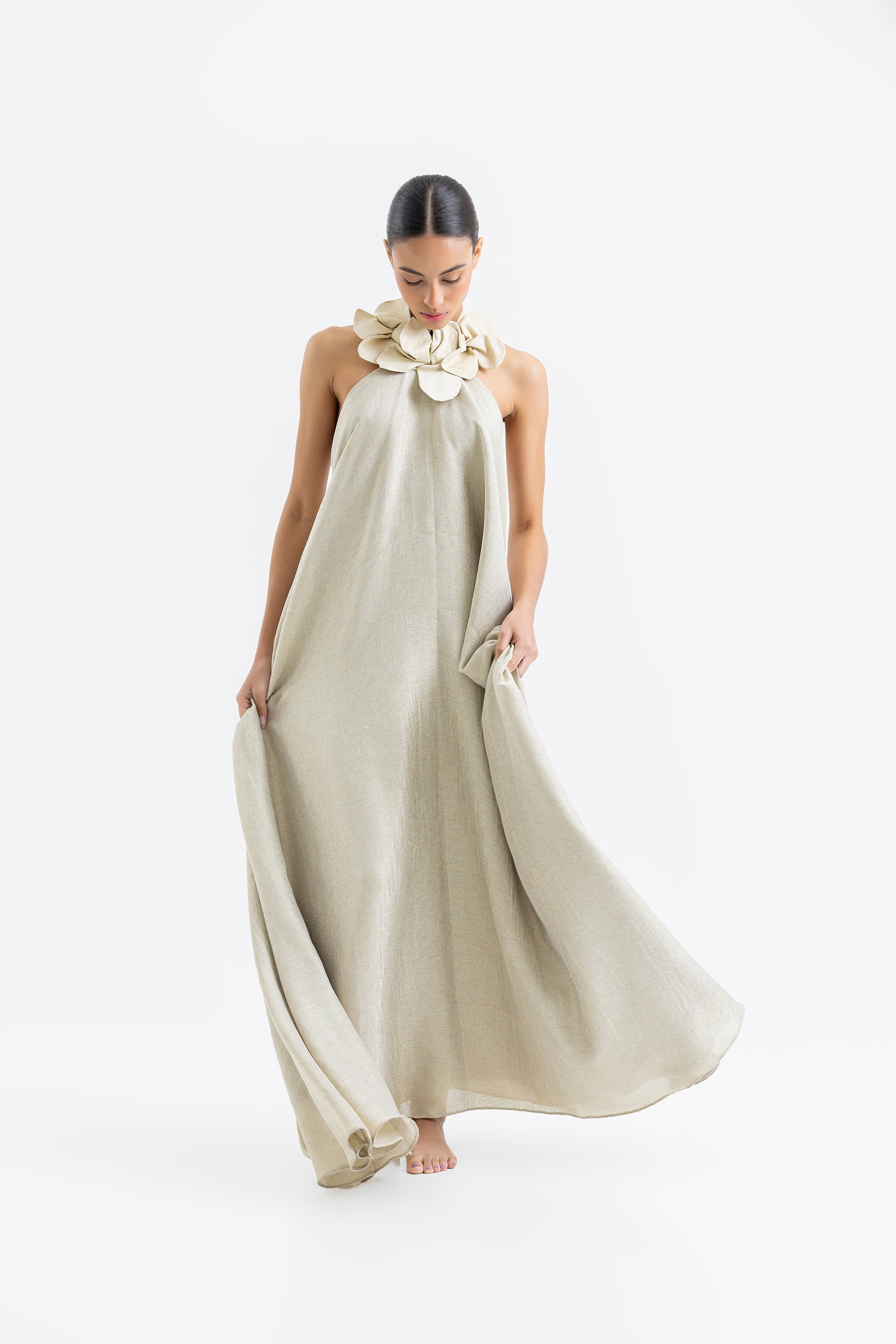 Maxi dress halter tipo slip on. Aplique de flores en el cuello con botones atras en el cuello. Espalda baja. Cinturón con flecos con un print tribal y flecos.
