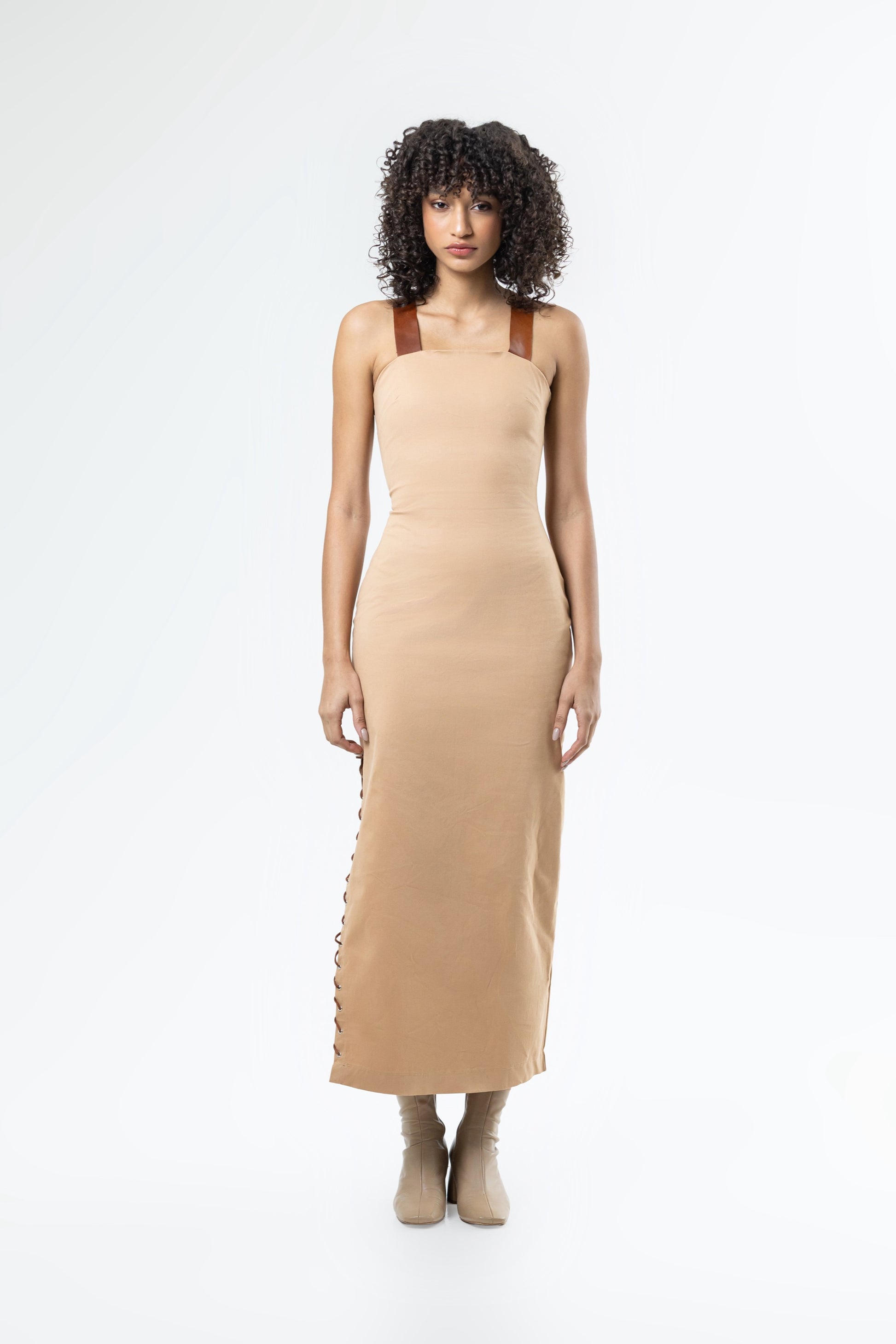 Vestido midi con tirantes y espalda de piel y ojaletes.