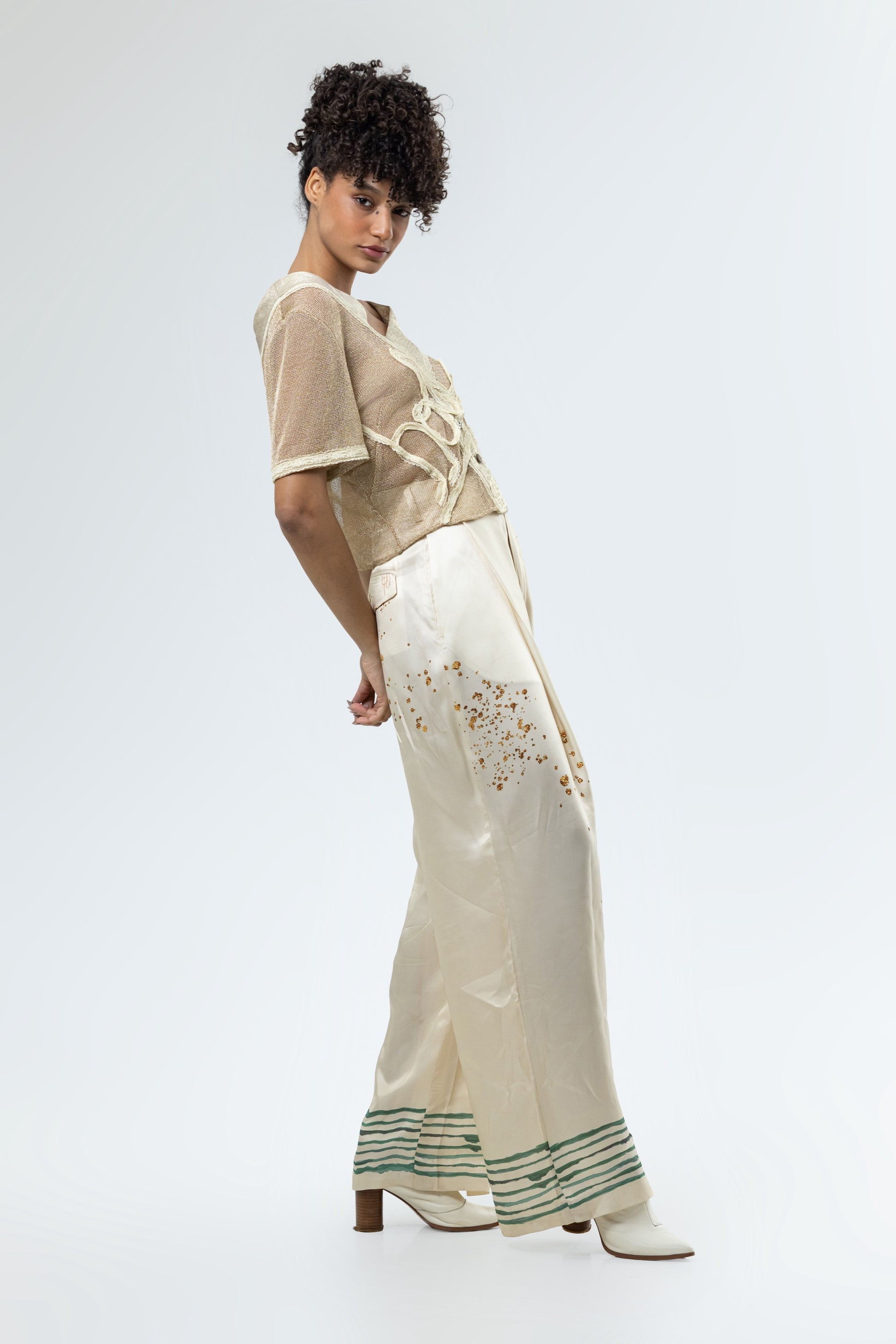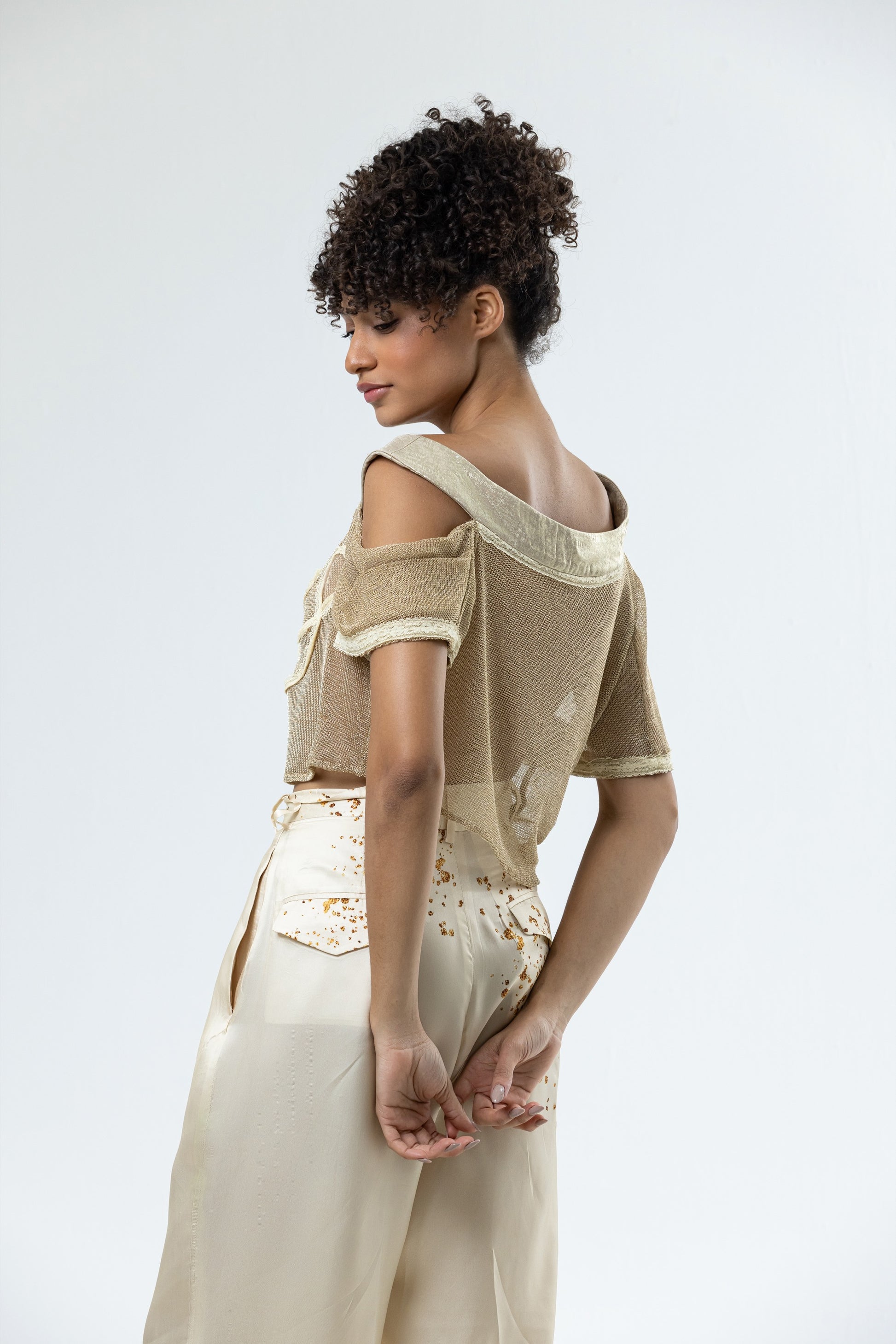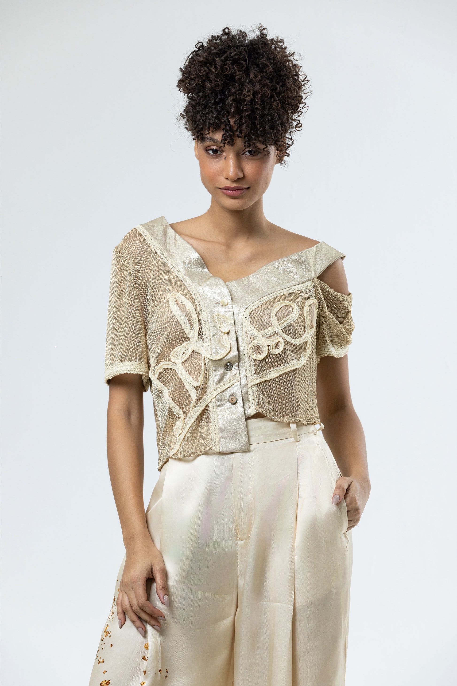 Pieza de Hols.e Atelier, blusa en malla dorada y tapeta de oro líquido y encaje en capas en contraste amarillo, completa con el logotipo de hols.e en encaje amarillo y botones desiguales.