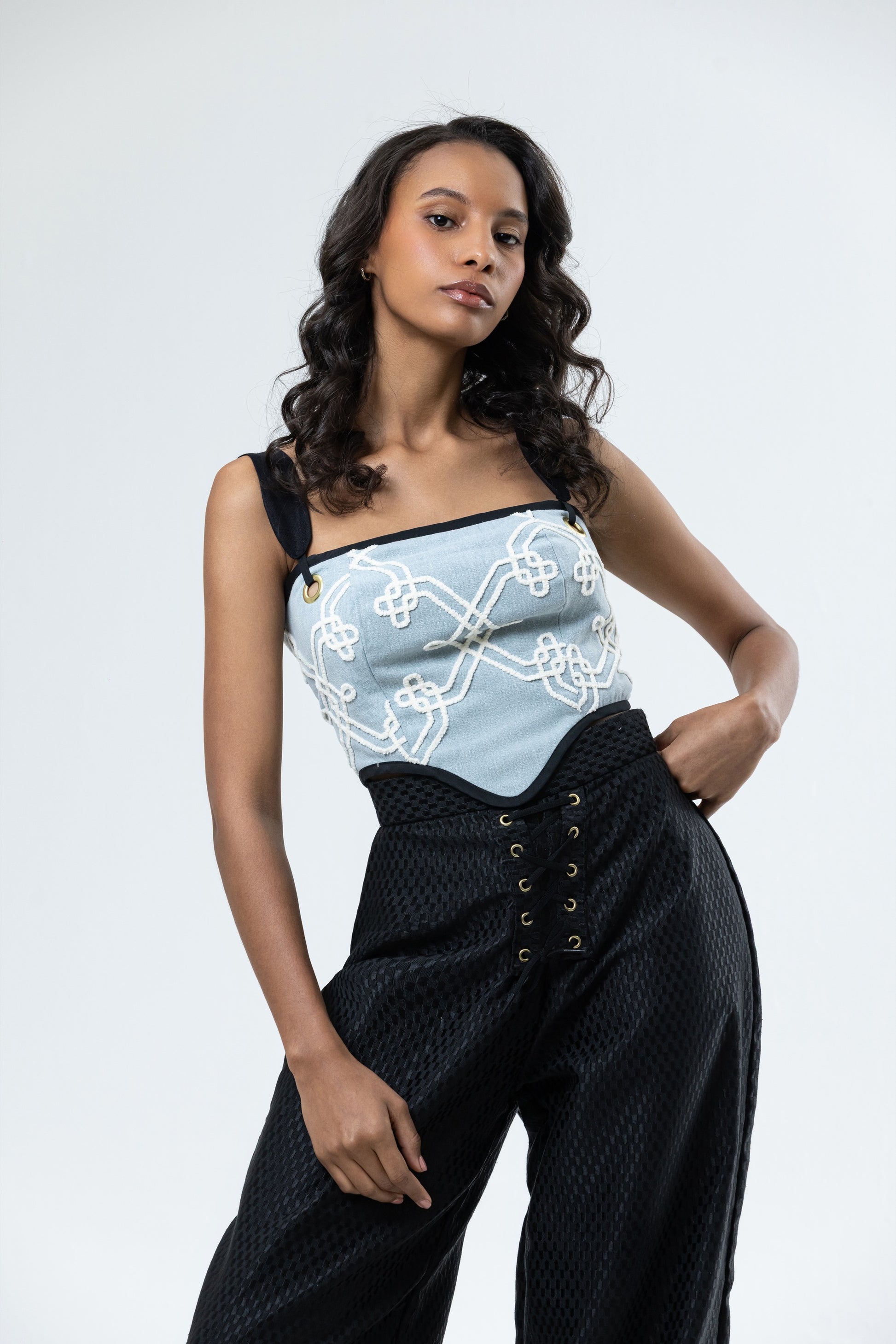 Blusa tipo corset largo con tiras en bolas y borde bordado.