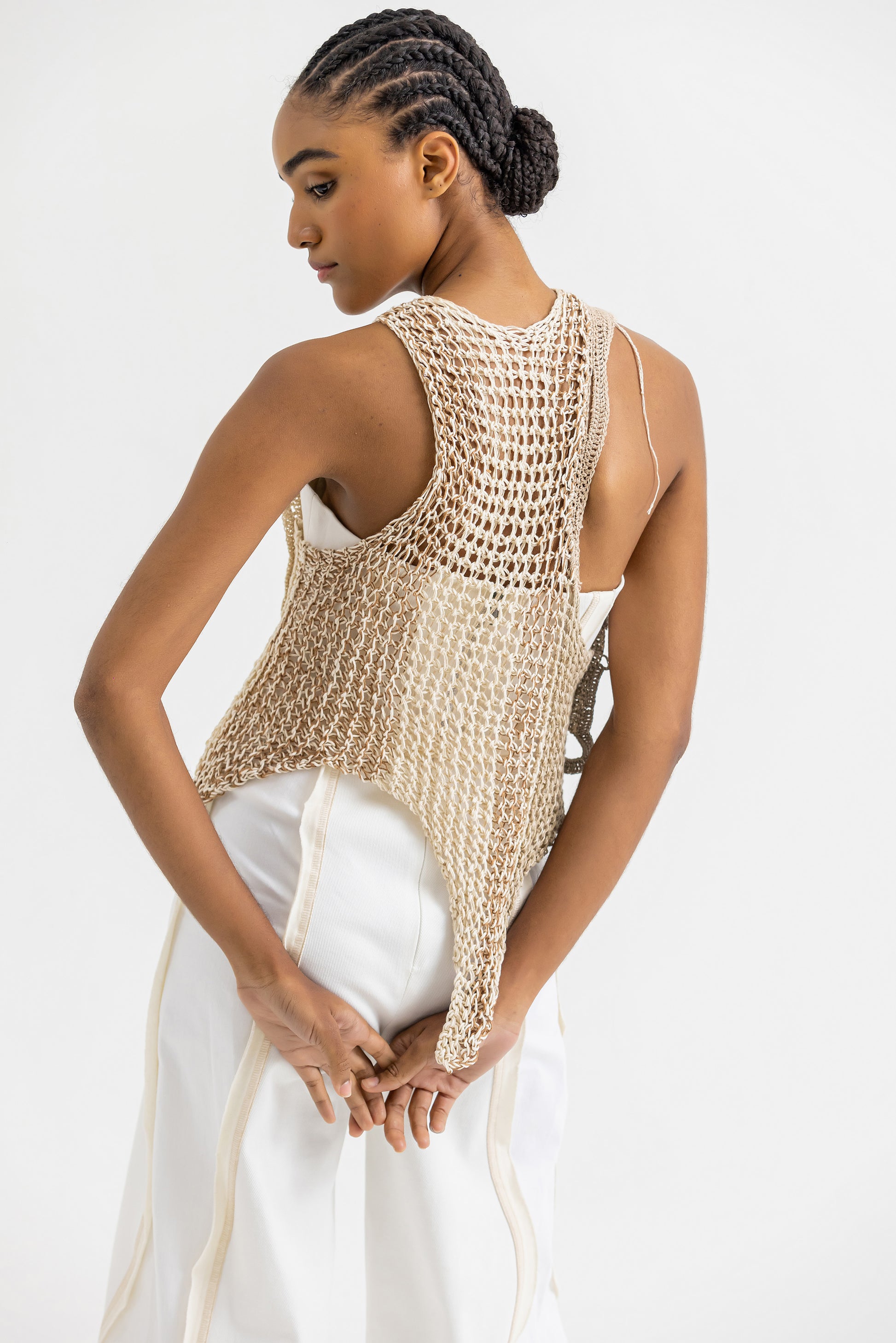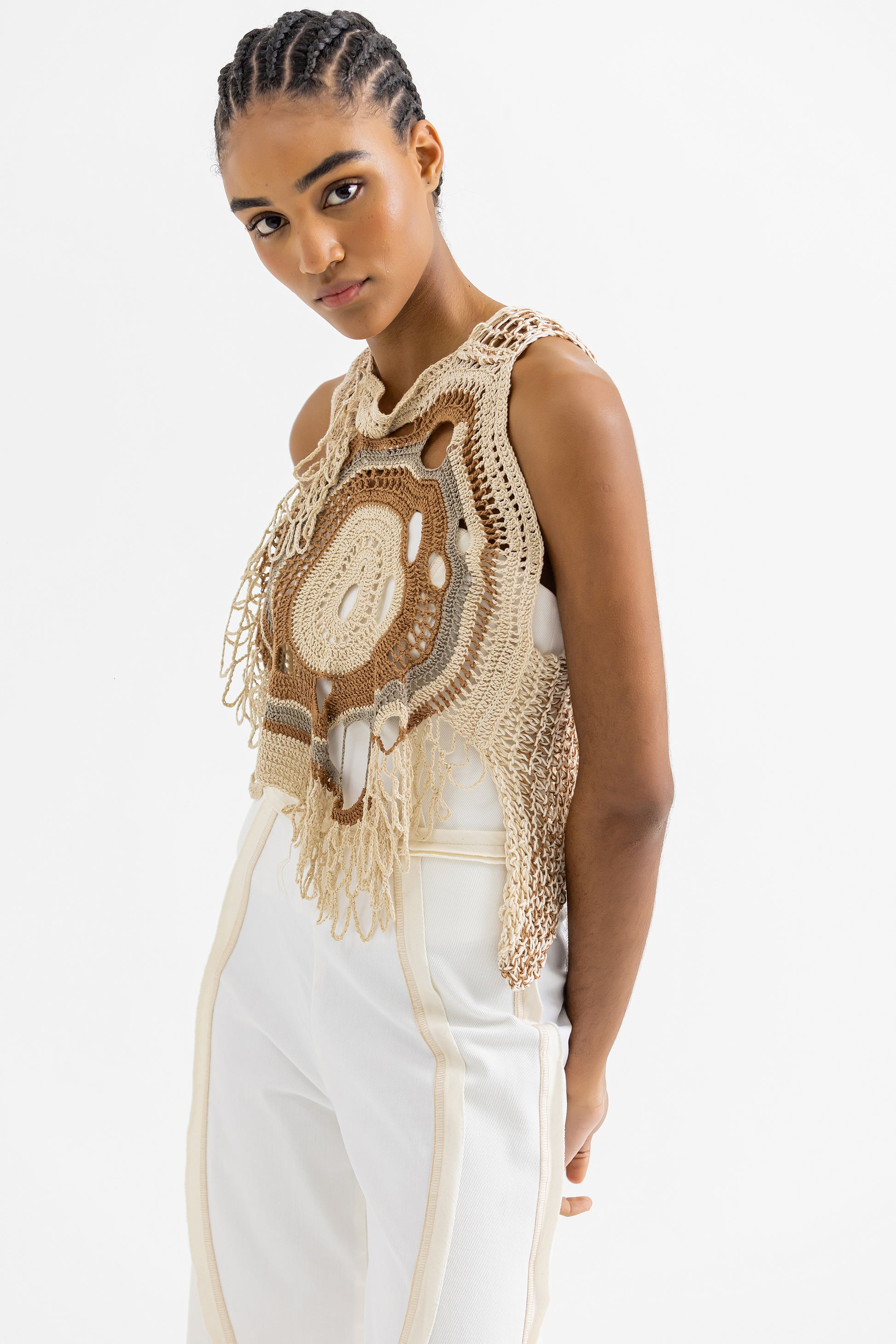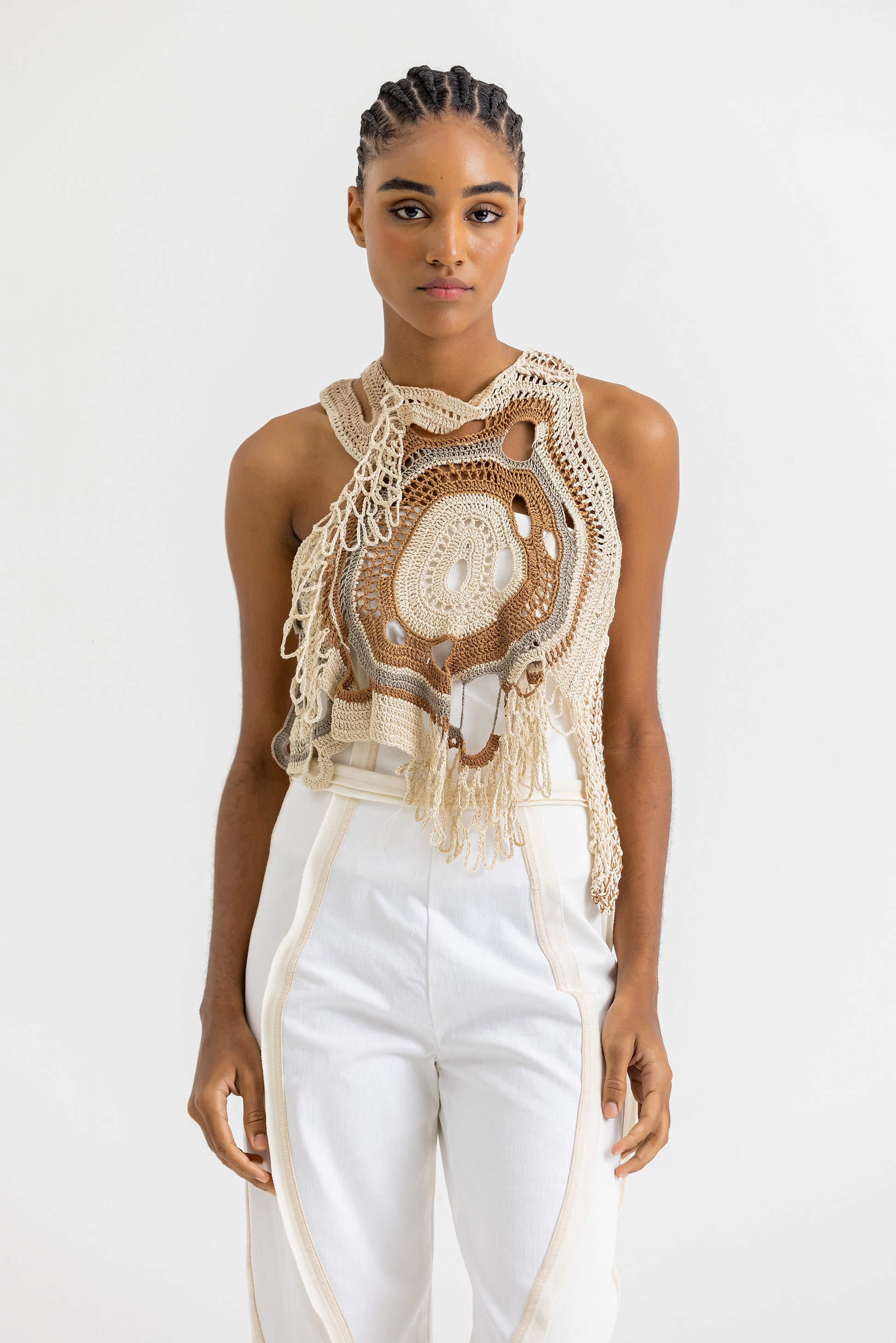 Pieza tejida a mano en técnica de crochet y dos agujas; es una pieza totalmente artesanal y trabajada desde la experimentación, reune los distintos tejidos usados en esta colección y los une en una sola pieza única.