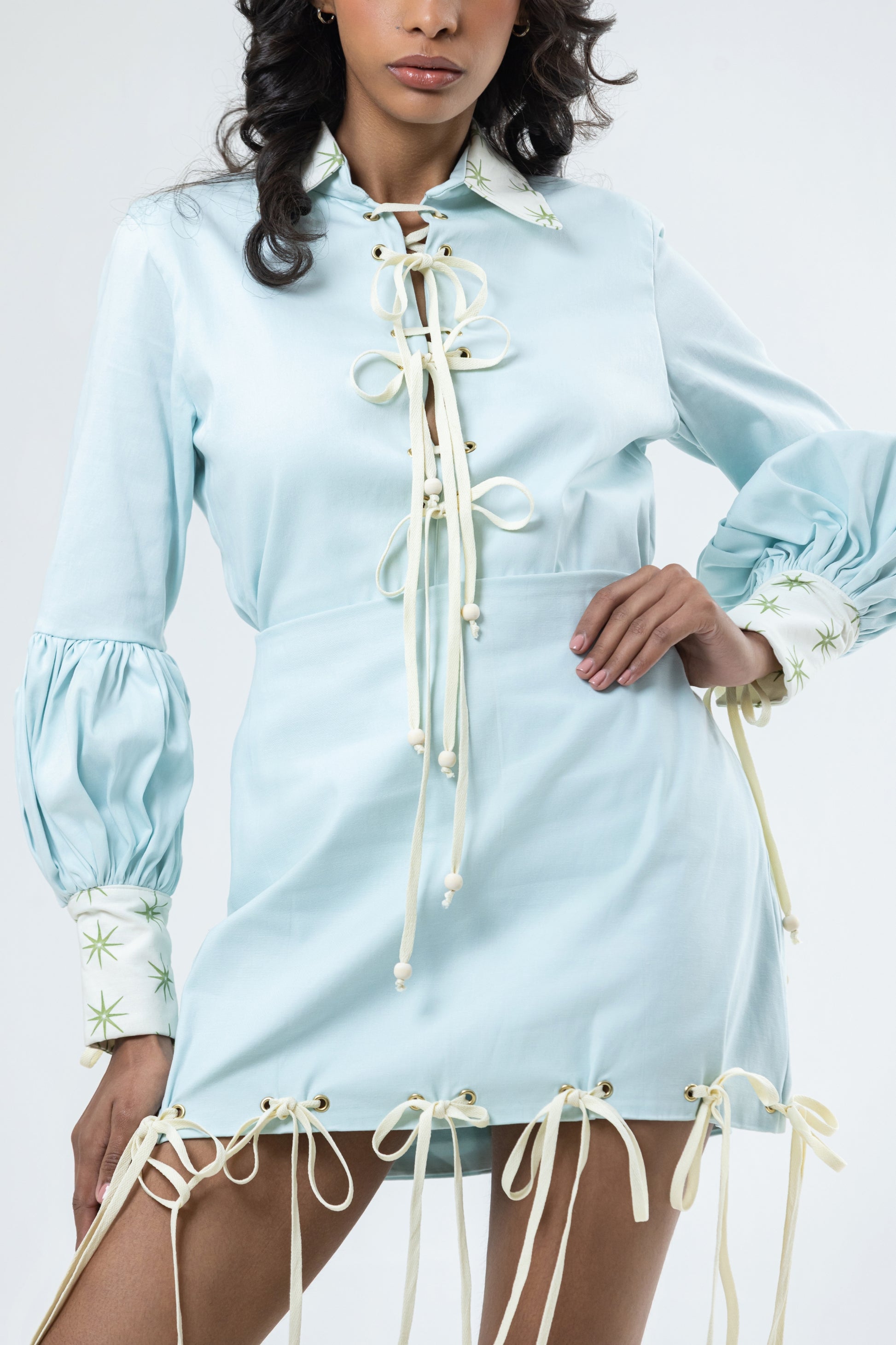 Falda talle alto con hojaletes y cordones.