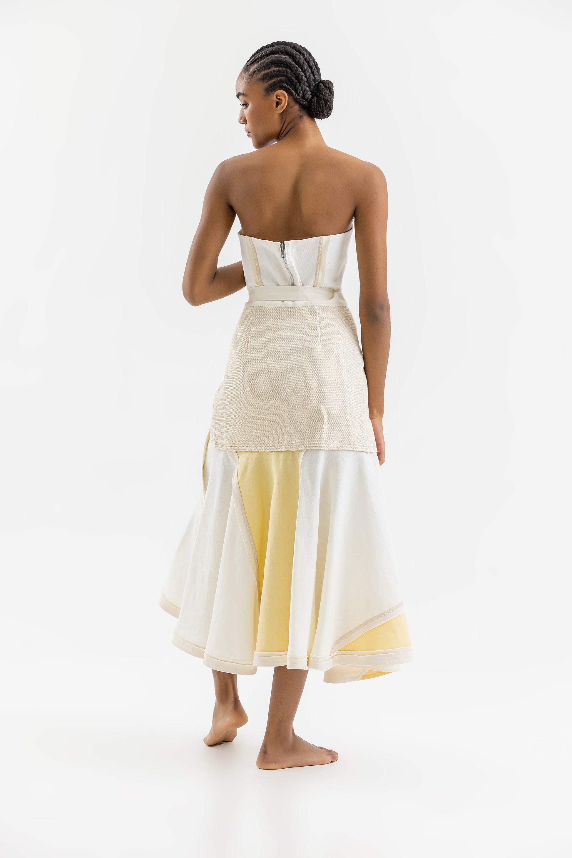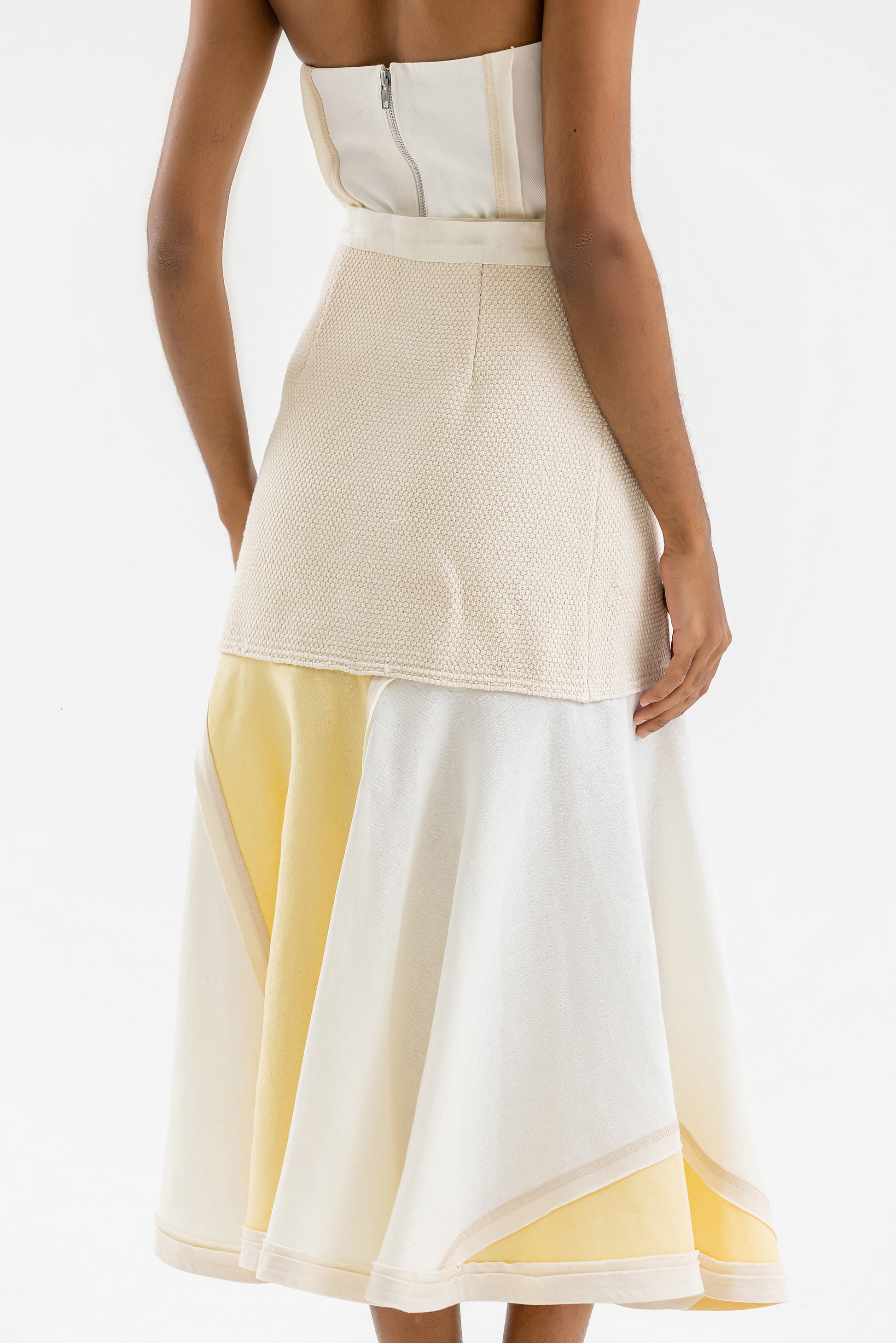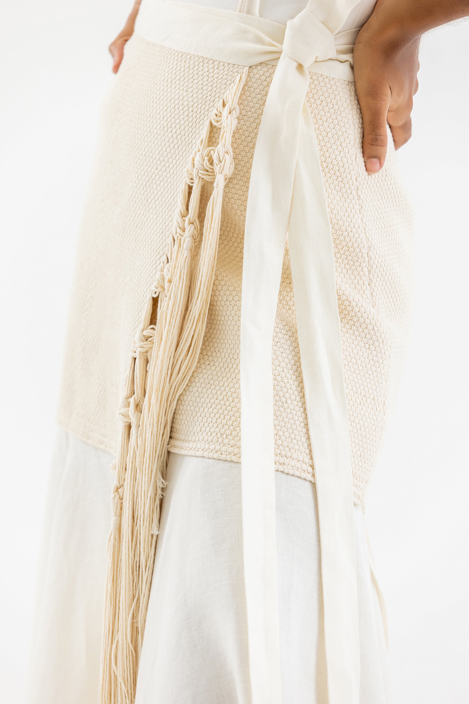 Wrap around falda artesanal con canesú en tela de hilos de algodón tejida por artesanos dominicanos, vuelo en tela de lino gruesa con un diseño textil conectado por sesgos cortados a mano.