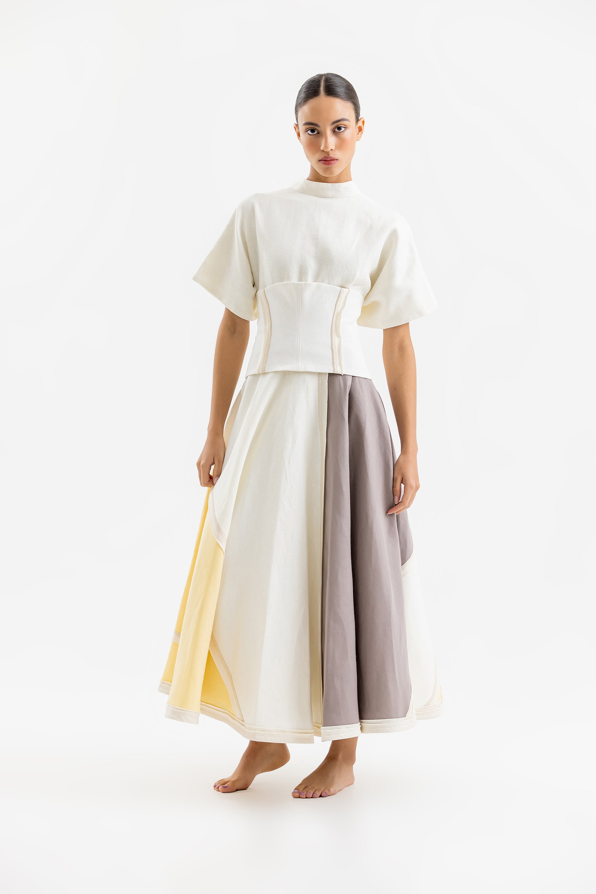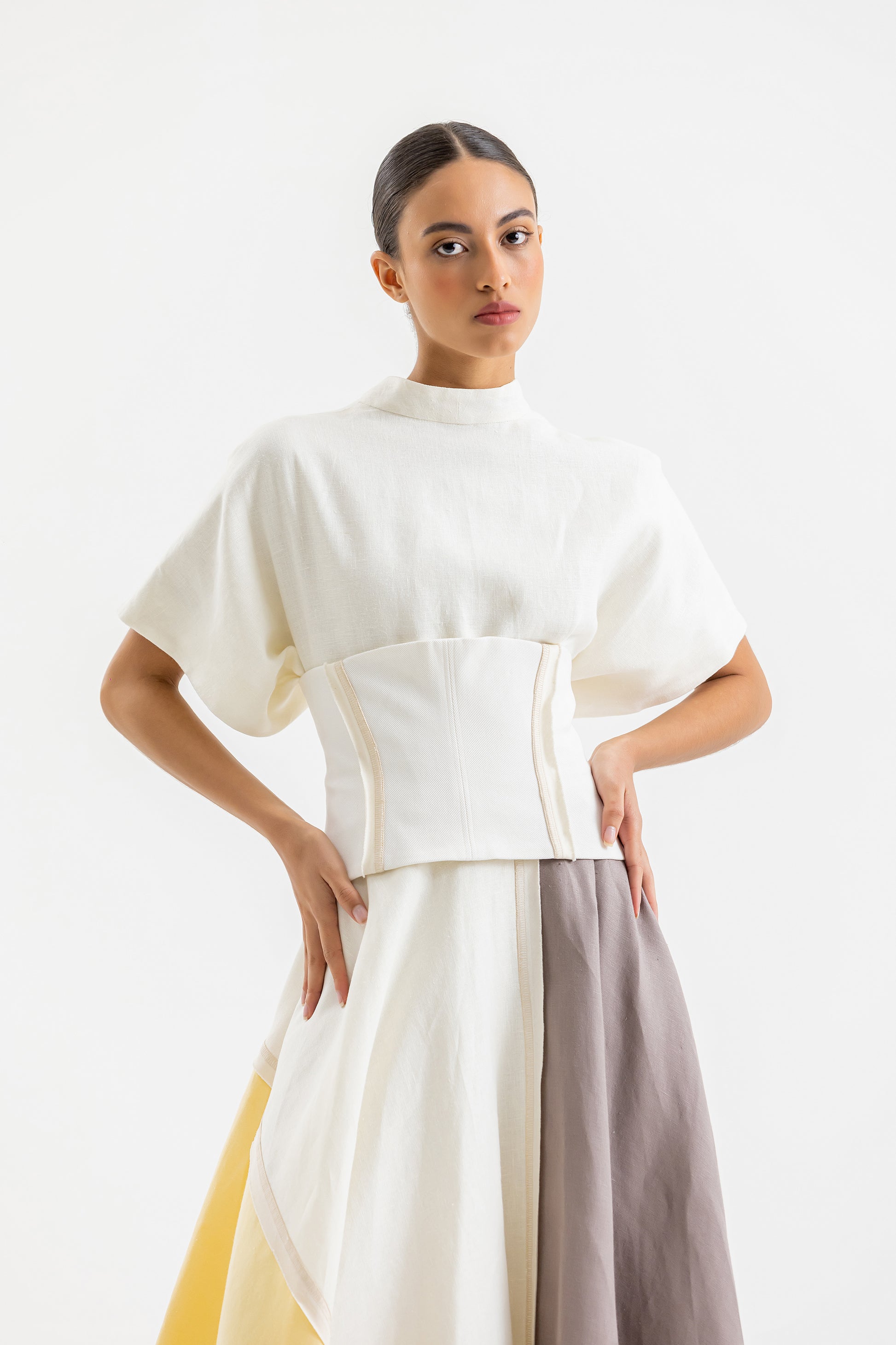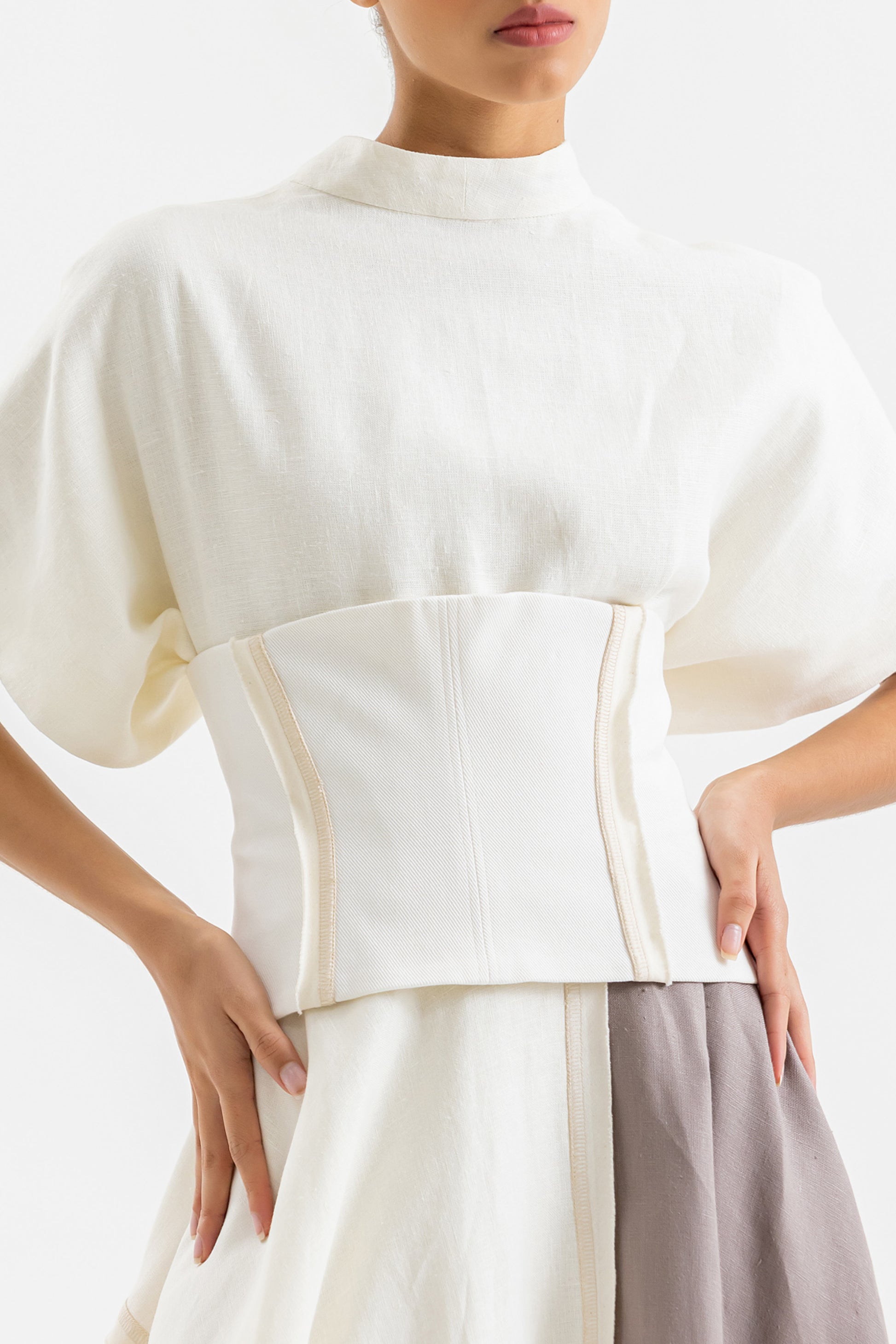 Corset tipo fajín trabajado en denim con base de algodón y detalles de sesgos cortados a mano, es una pieza perfecta para obtener un look mas ajustado.