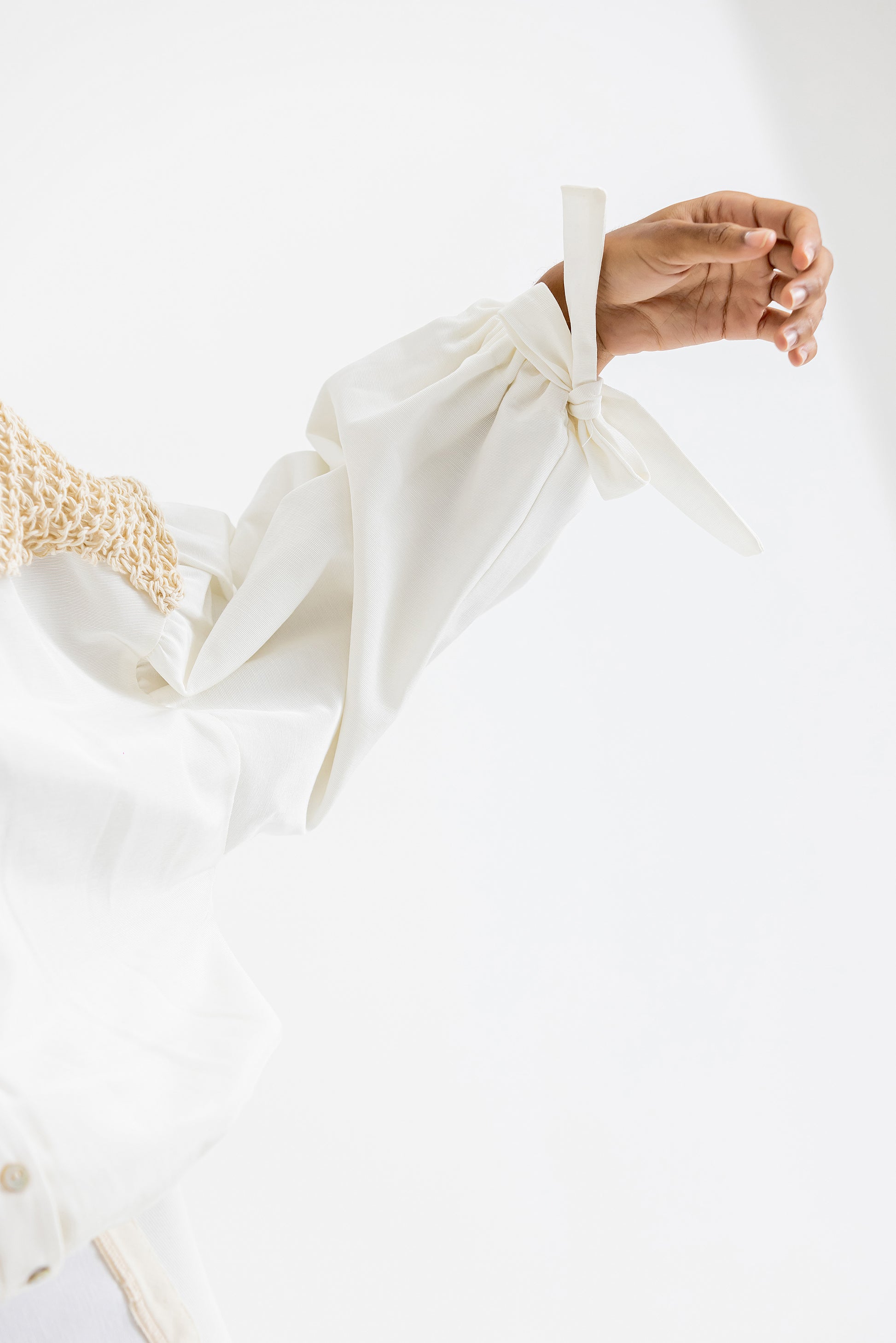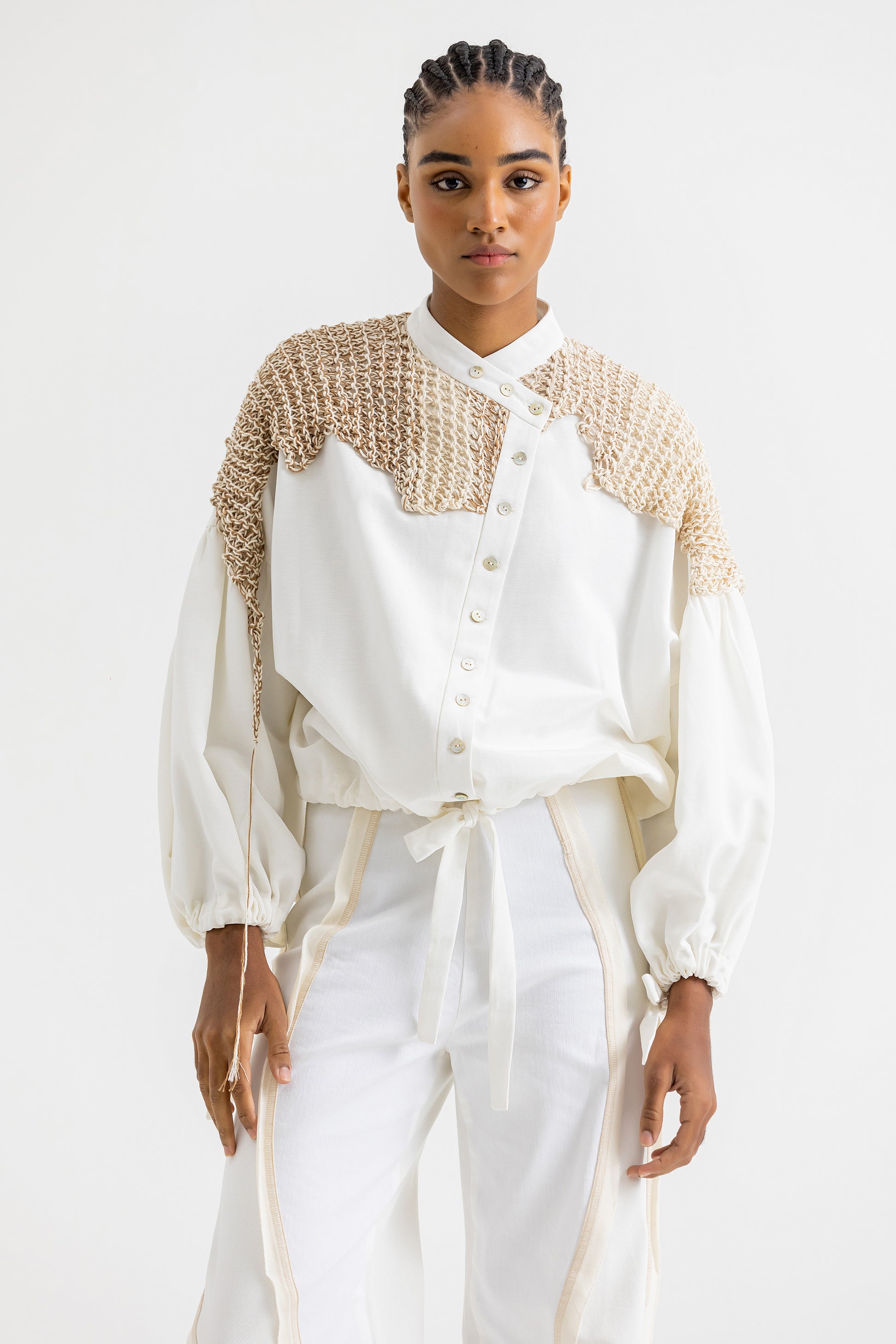 Esta chaqueta se inspira en la tradicional chaqueta tipo Bomber usada por los Lechones De Santiago, trabajada en una tela de gross ligera y un tejido de hilos de algodón y lino hecho totalmente a mano, el diseño del tejido nace del estampado de una chaqueta de los Lechones de Pueblo Nuevo, Santiago. Es una versión femenina y atemporal de su tradicional chaqueta de traje.