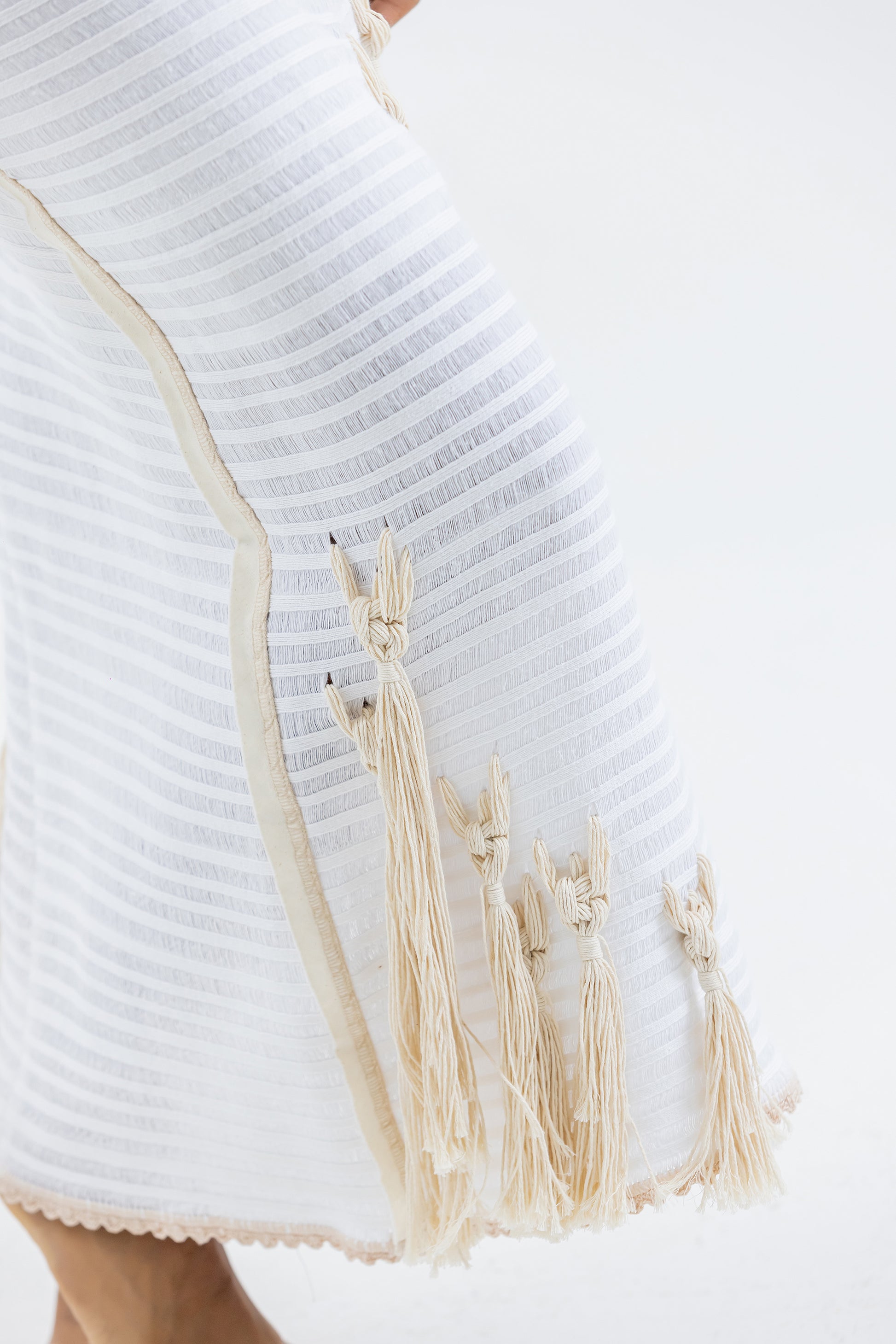 Falda de corte recto y abierto en el costado izquierdo con borlas de hilo de algodón, las terminaciones del ruedo son trabajadas a mano en crochet