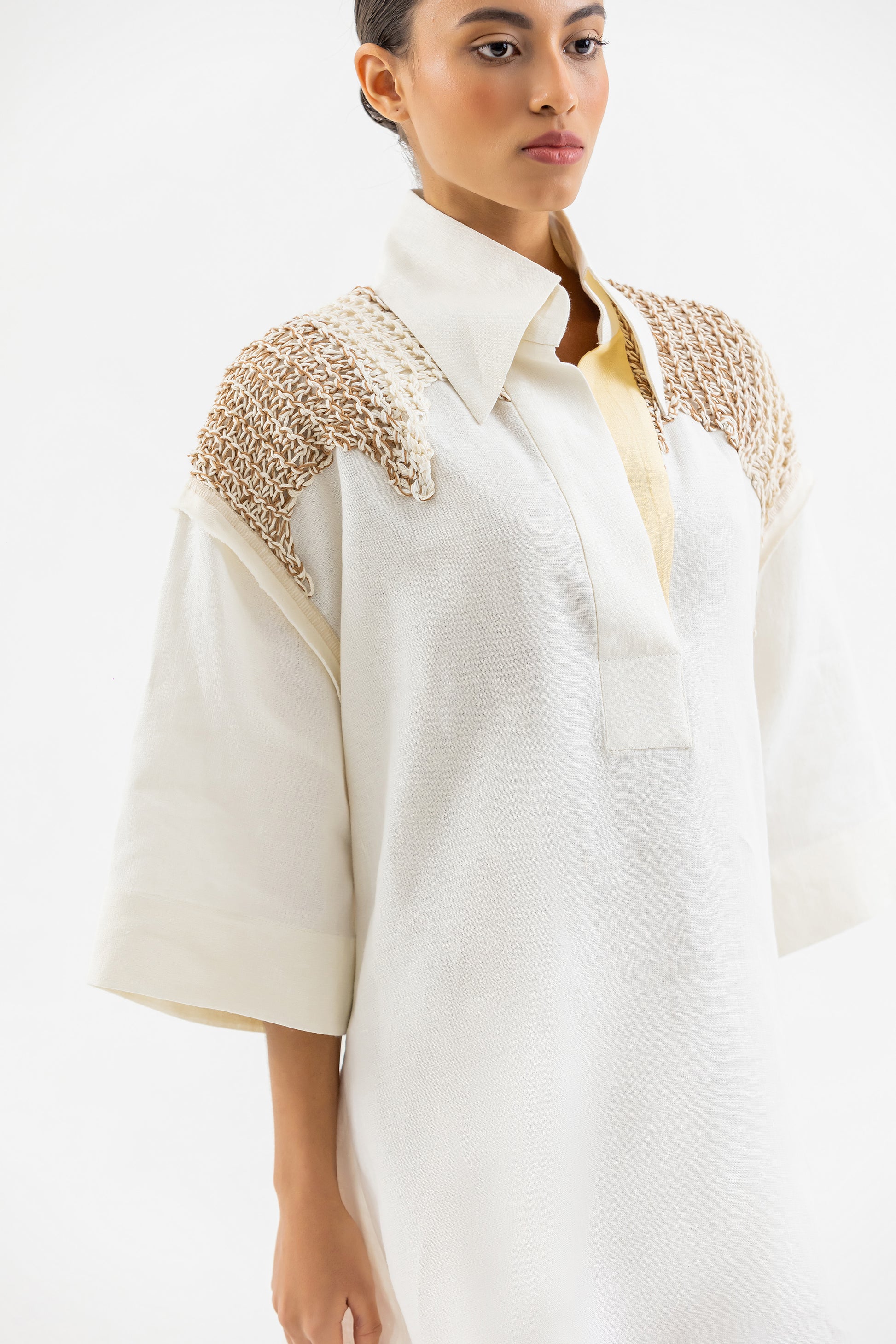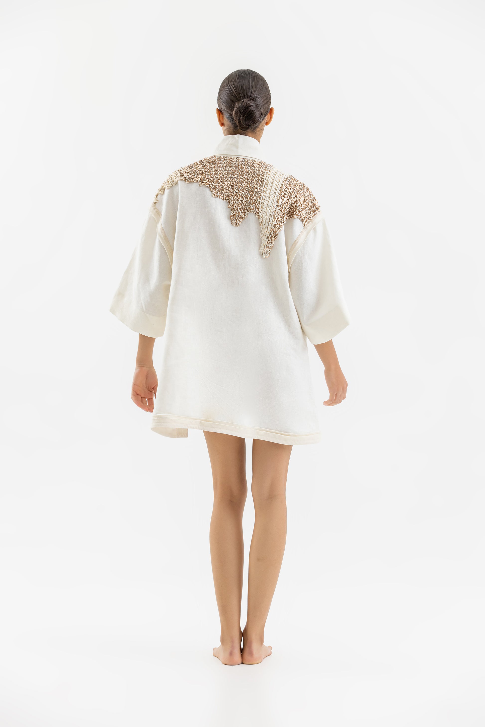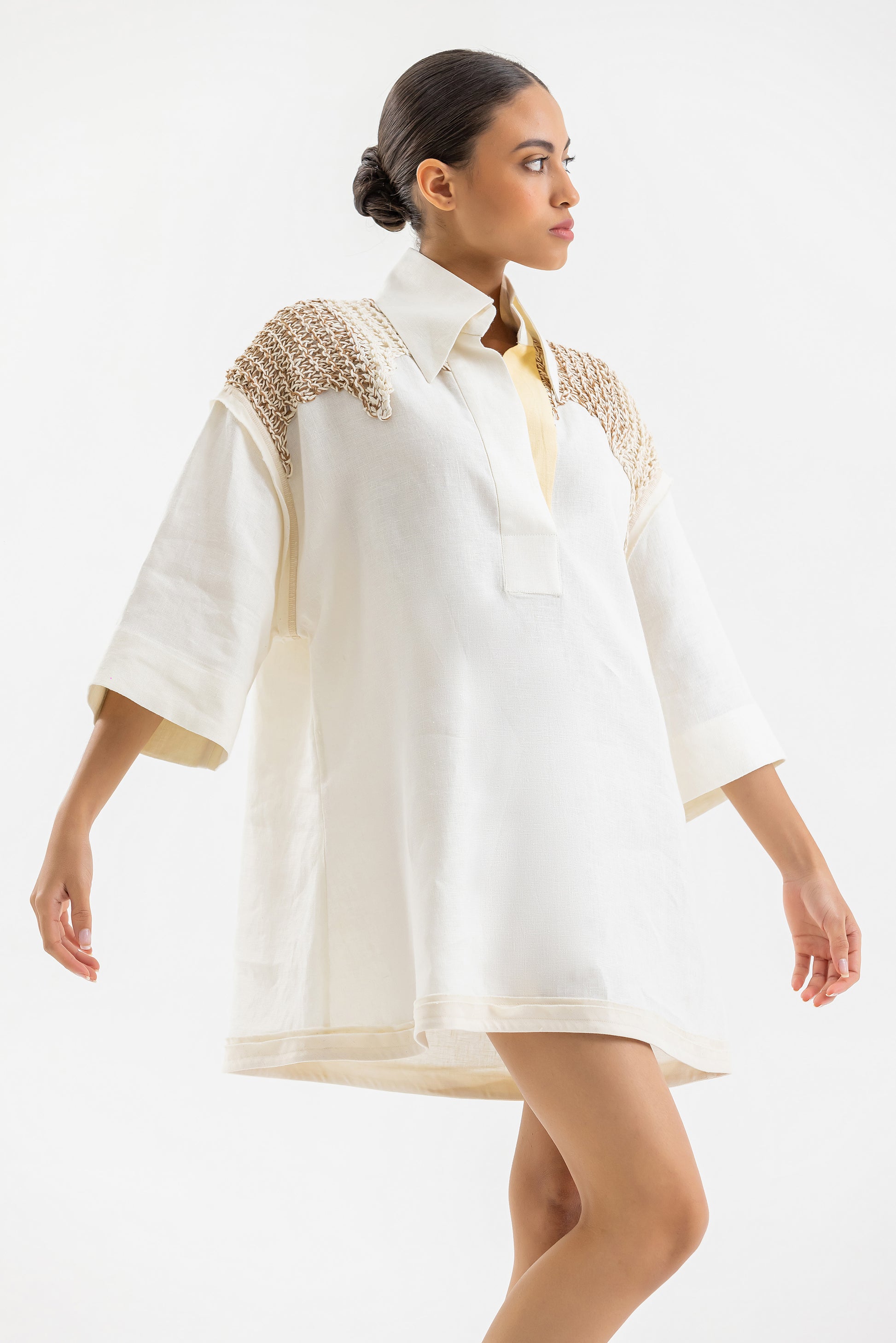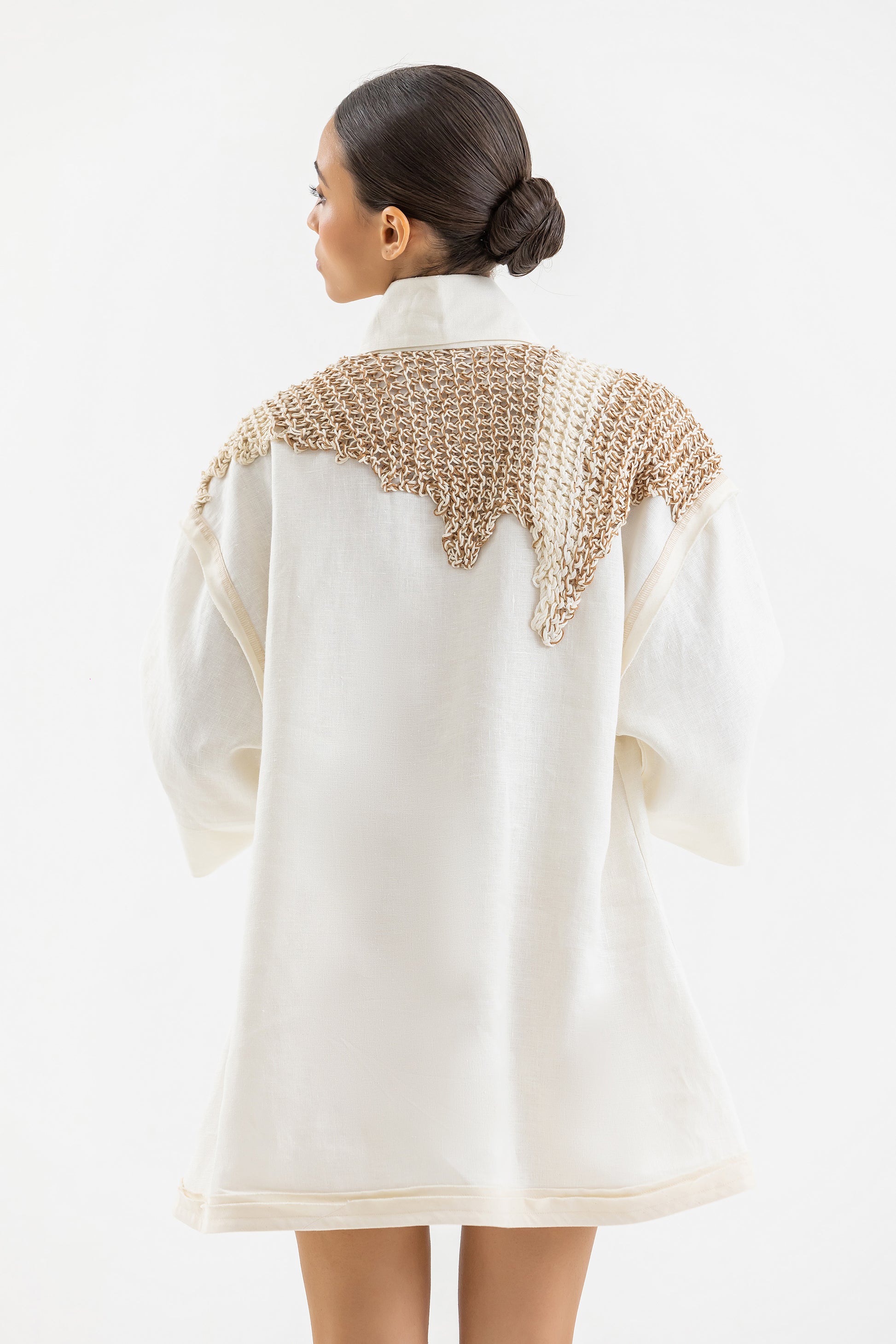 Mini Dress Camisero trabajado en lino Off White con detalle de plaqueta inferior en amarillo. La espalda es tejida a mano en hilos de lino y algodón y el diseño del tejido es inspirado en el estampado del traje de los Lechones de Pueblo Nuevo, Santiago.