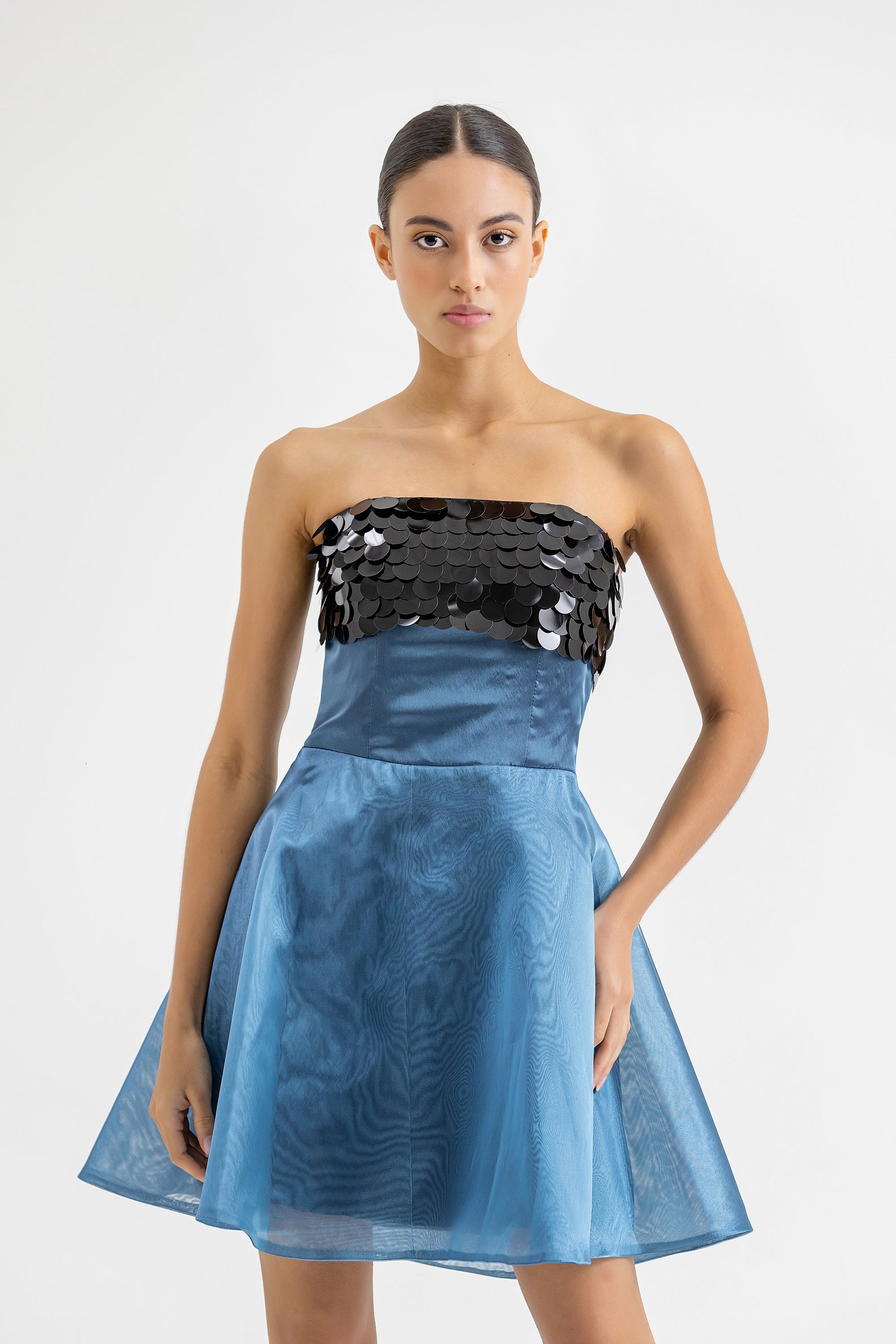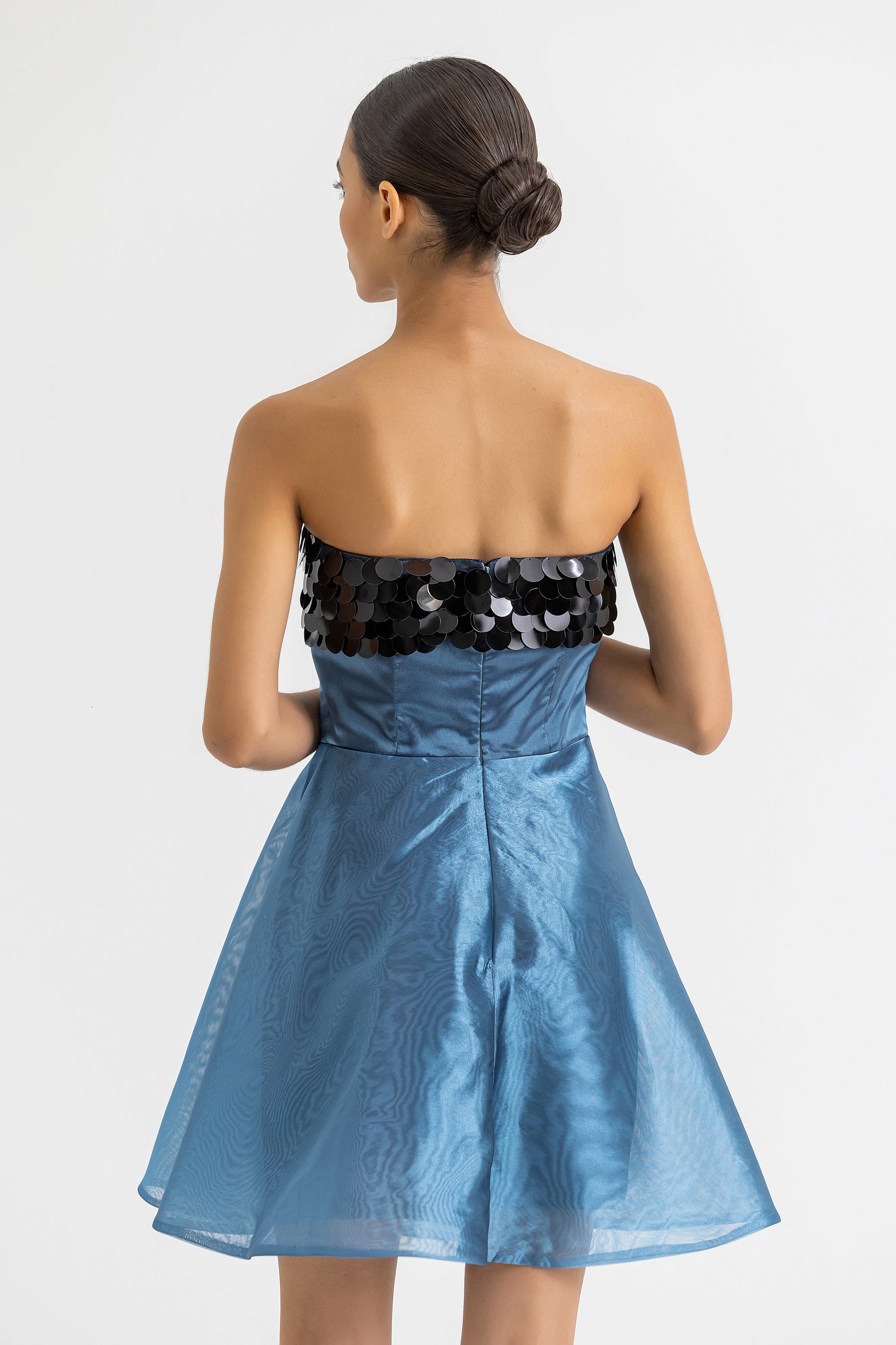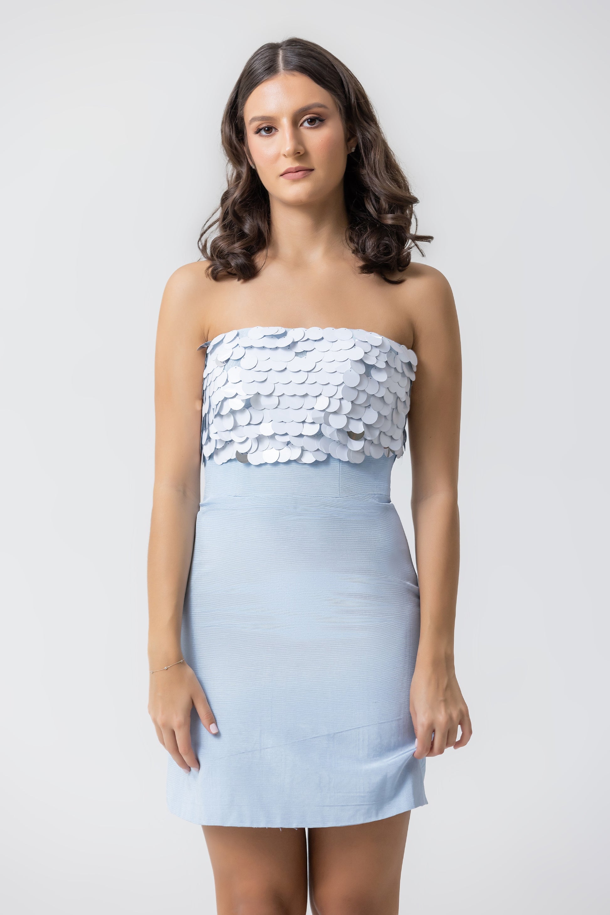 Mini vestido con aplique en el area del busto de lentejuelas y corte en la cintura para mejor entalle. Zipper invisible en la espalda.