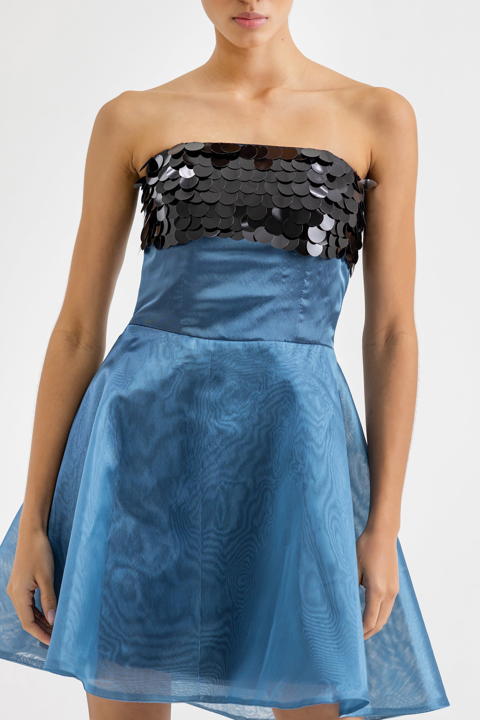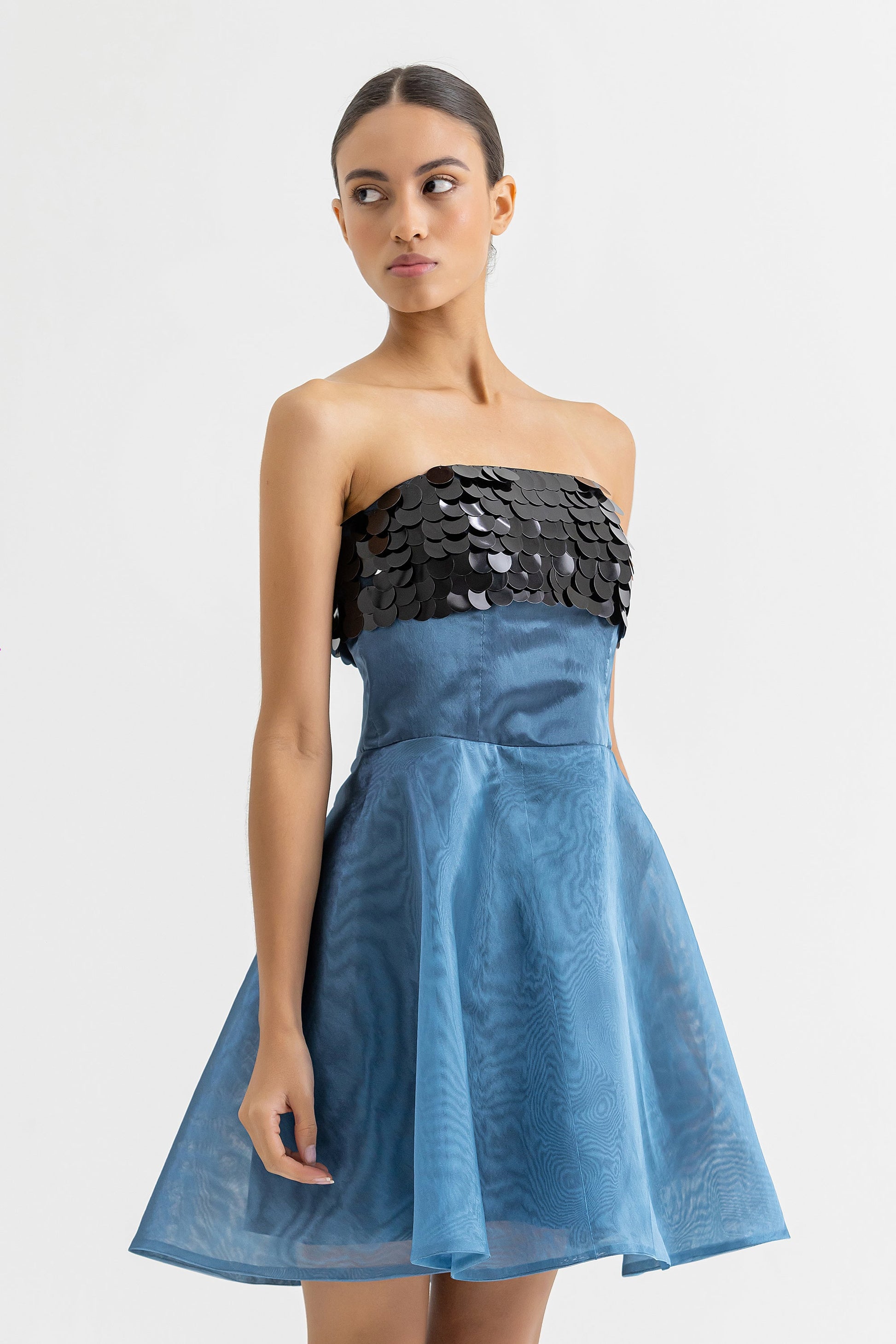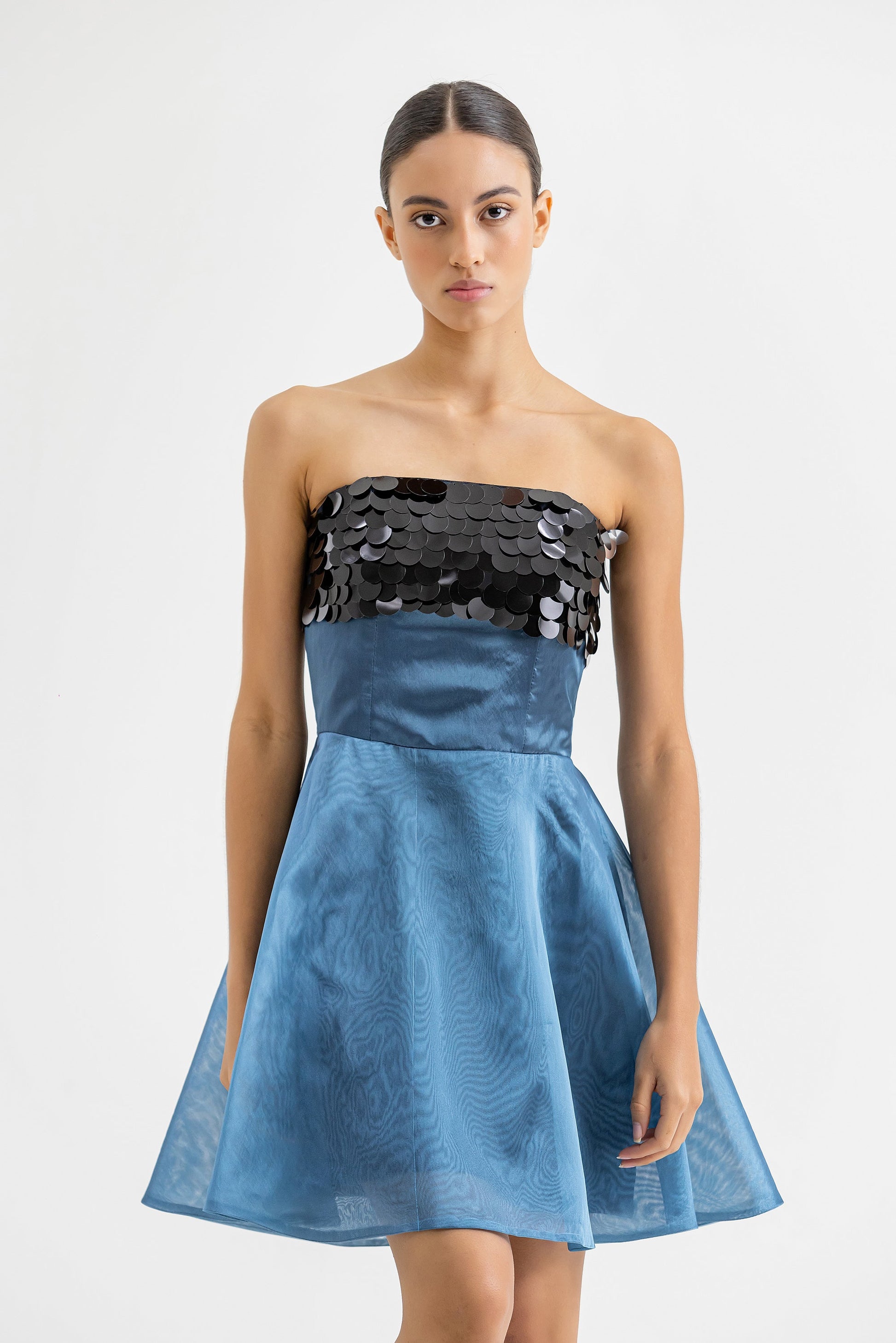 Mini vestido con aplique en el area del busto de lentejuelas y corte en la cintura para mejor entalle. Zipper invisible en la espalda.