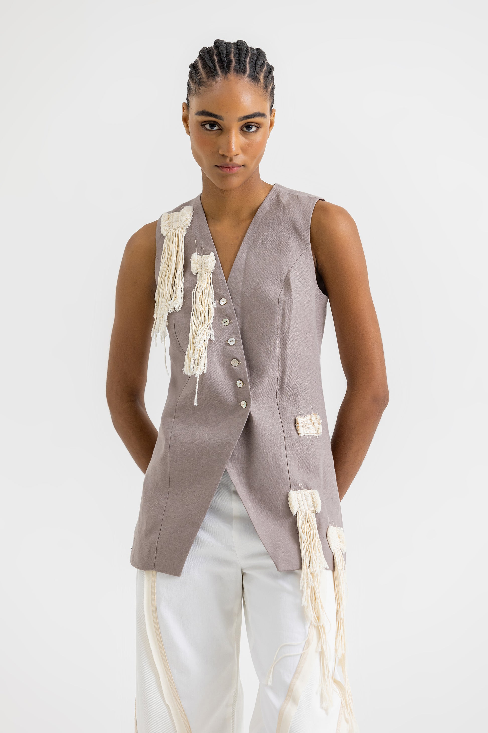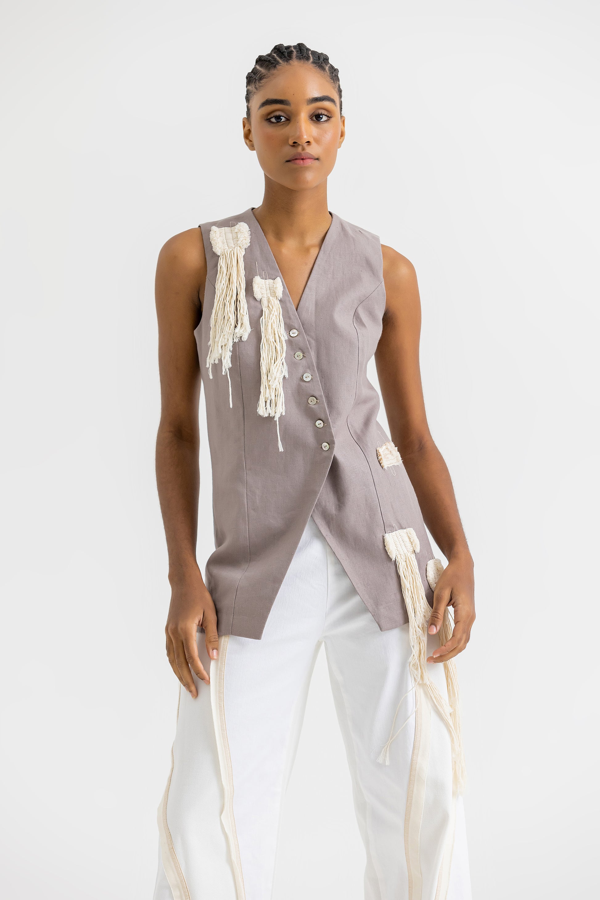 Vest largo trabajado en lino con detalles en borla de hilo de algodón inspiradas en los Lechones Pepineros De Santiago.