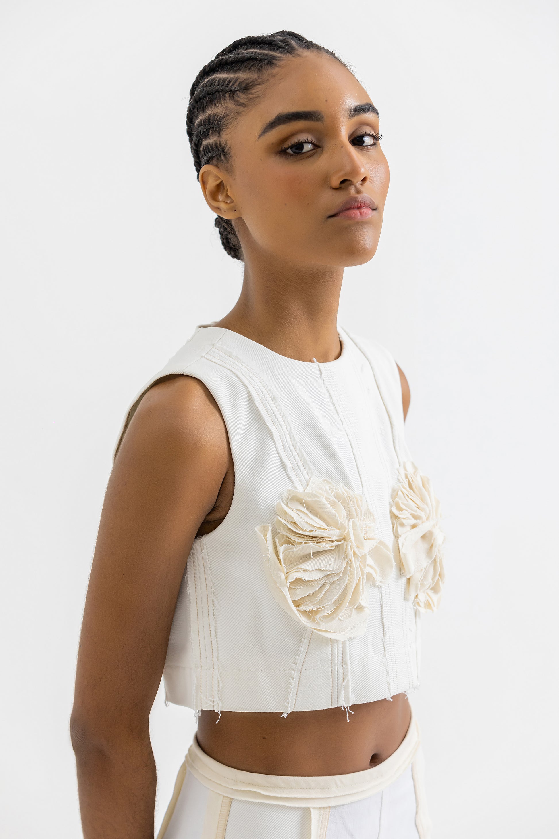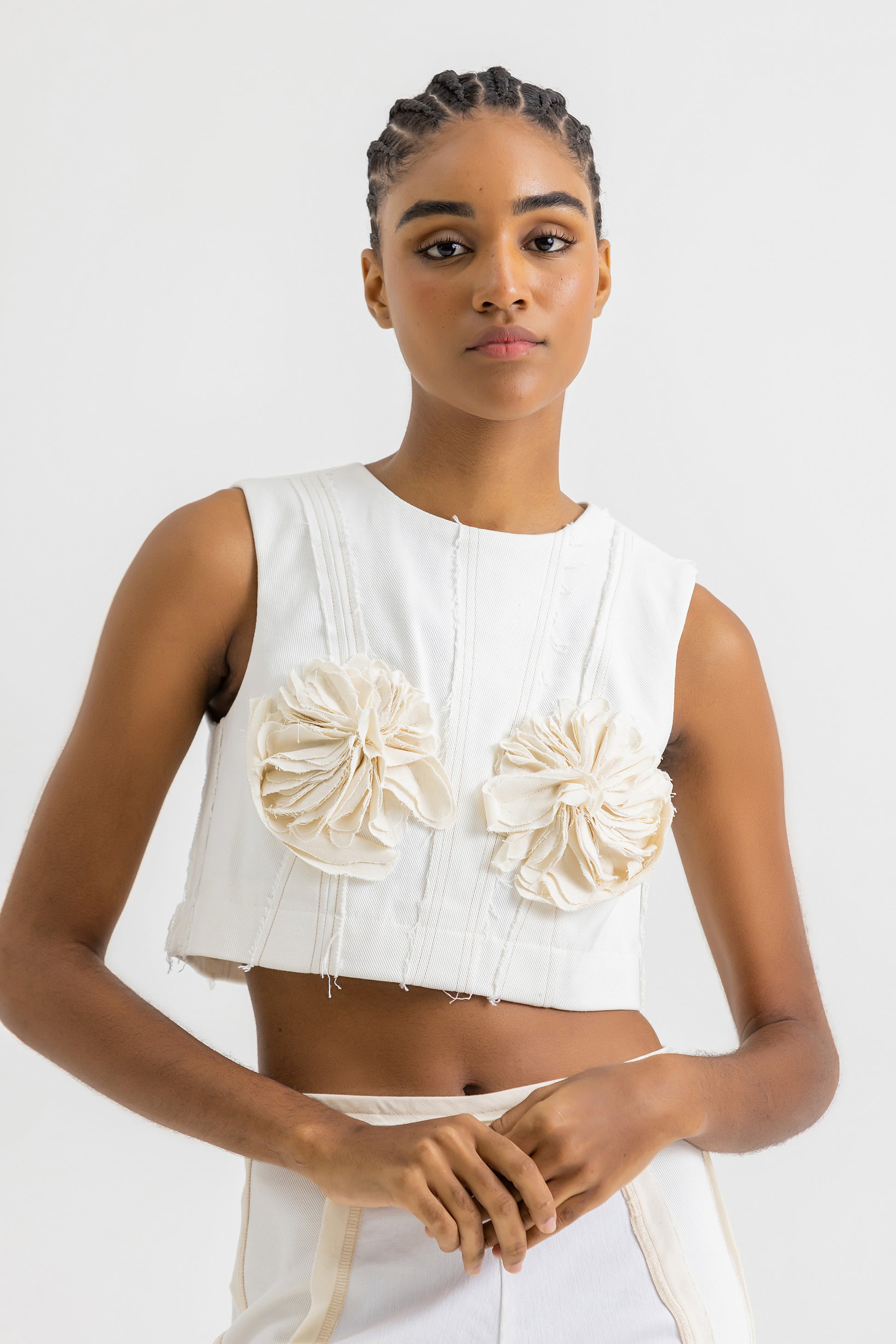 Crop Top en tela artesanal hecha a partir de restos de denim Off-White y blanco, haciendo cada pieza diferente y única. Las flores en tela de algodón cremas son tomadas de las icónicas caretas de los Lechones de Pueblo Nuevo, Santiago.