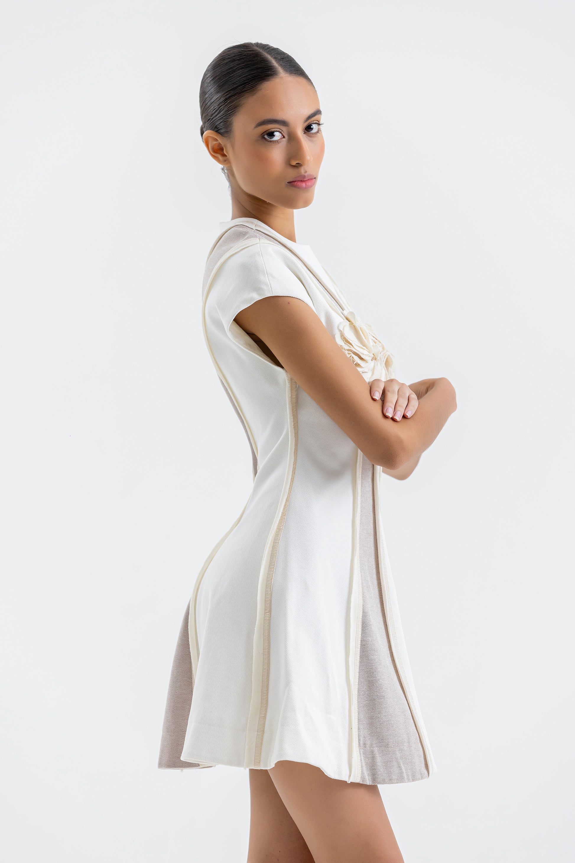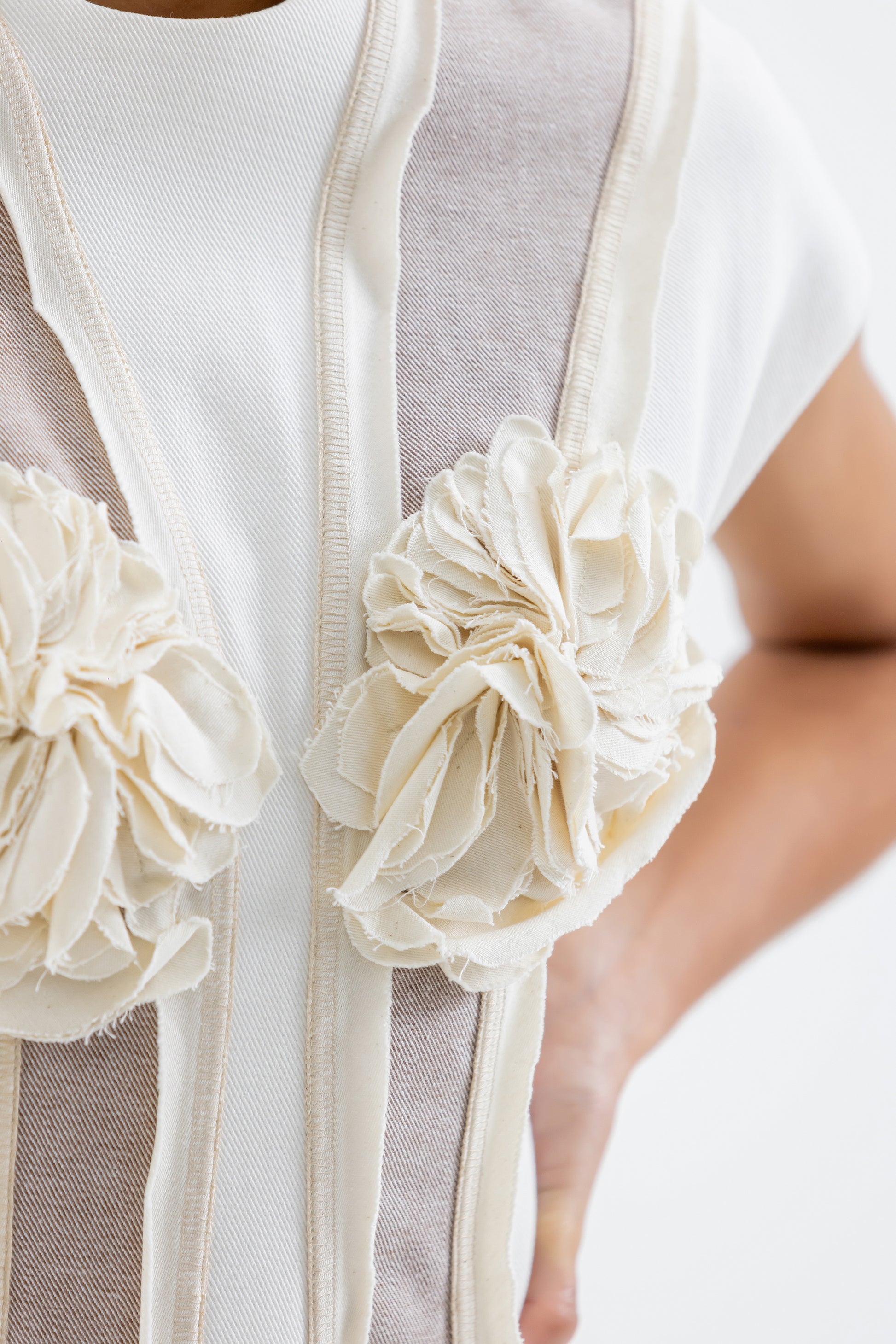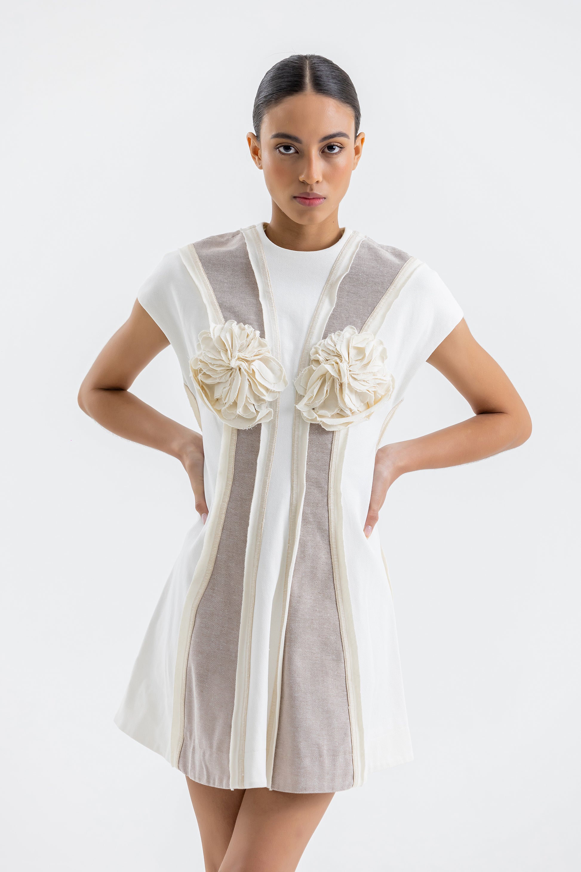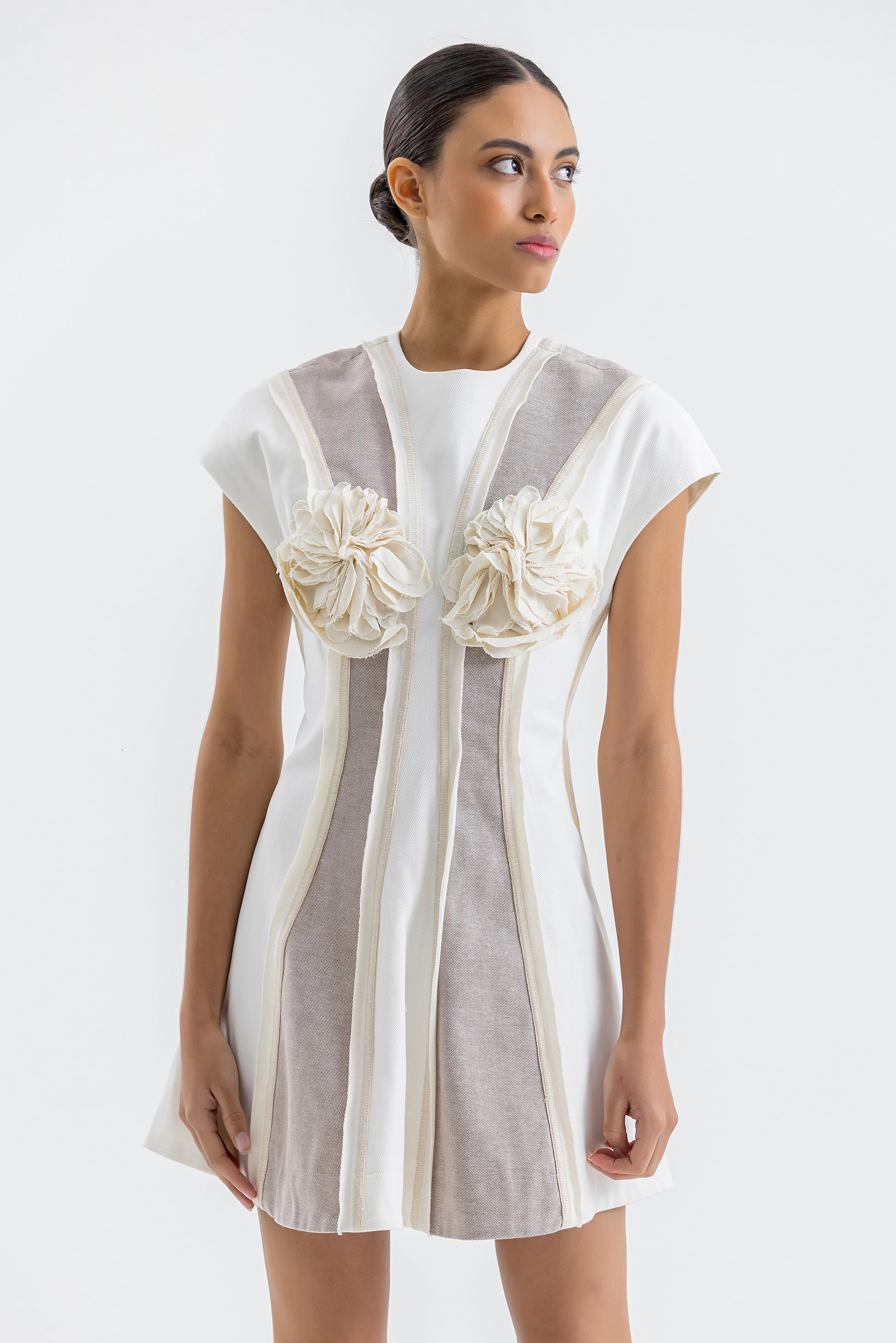 Mini Dress trabajado en Denim Off-White y Color marrón, unidos por sesgos de algodón cortados a mano. Las flores en tela de algodón cremas son tomadas de las icónicas caretas de los Lechones de Pueblo Nuevo, Santiago.