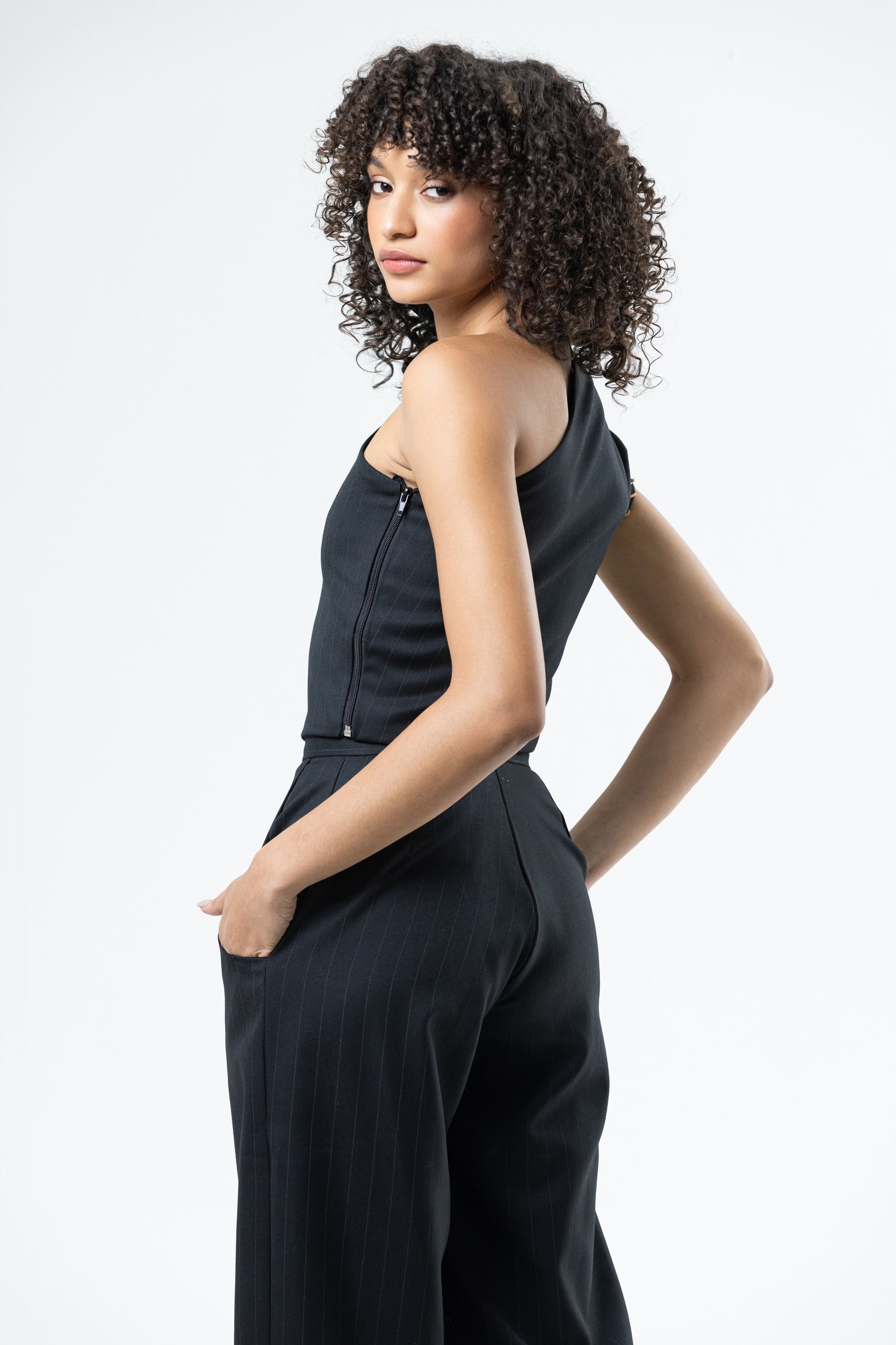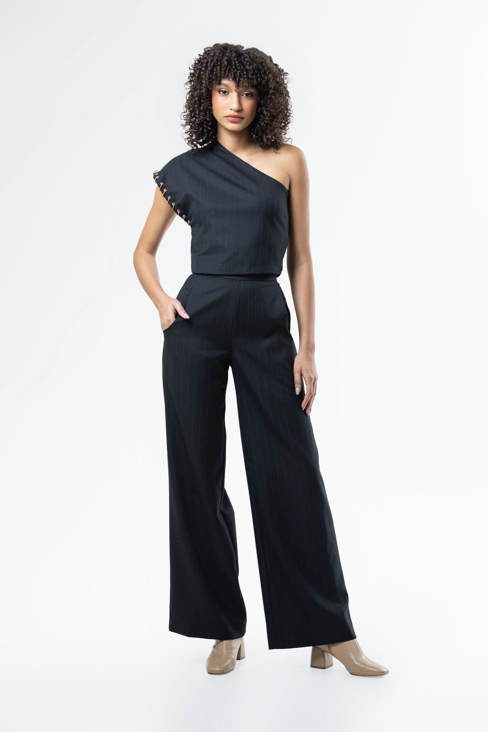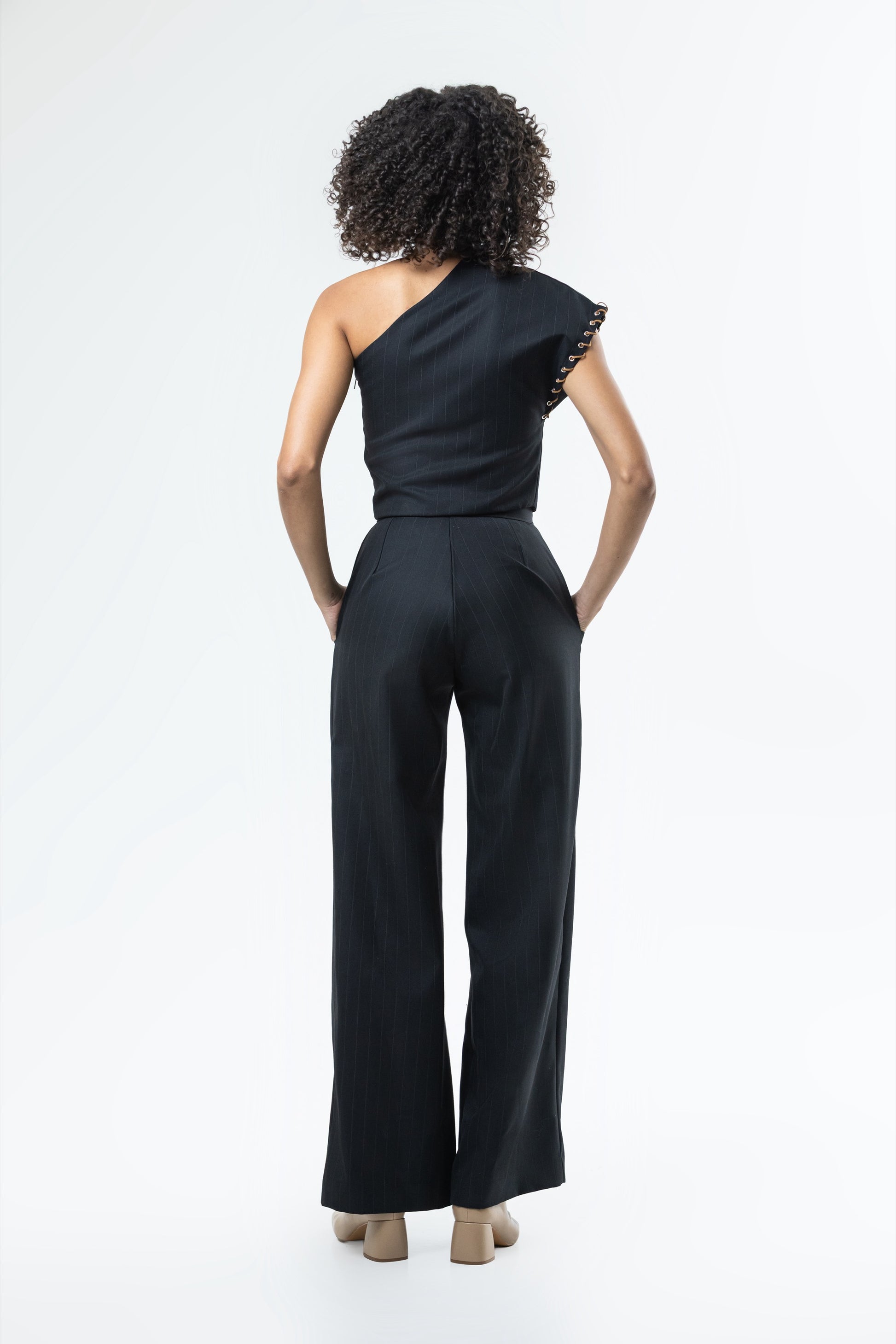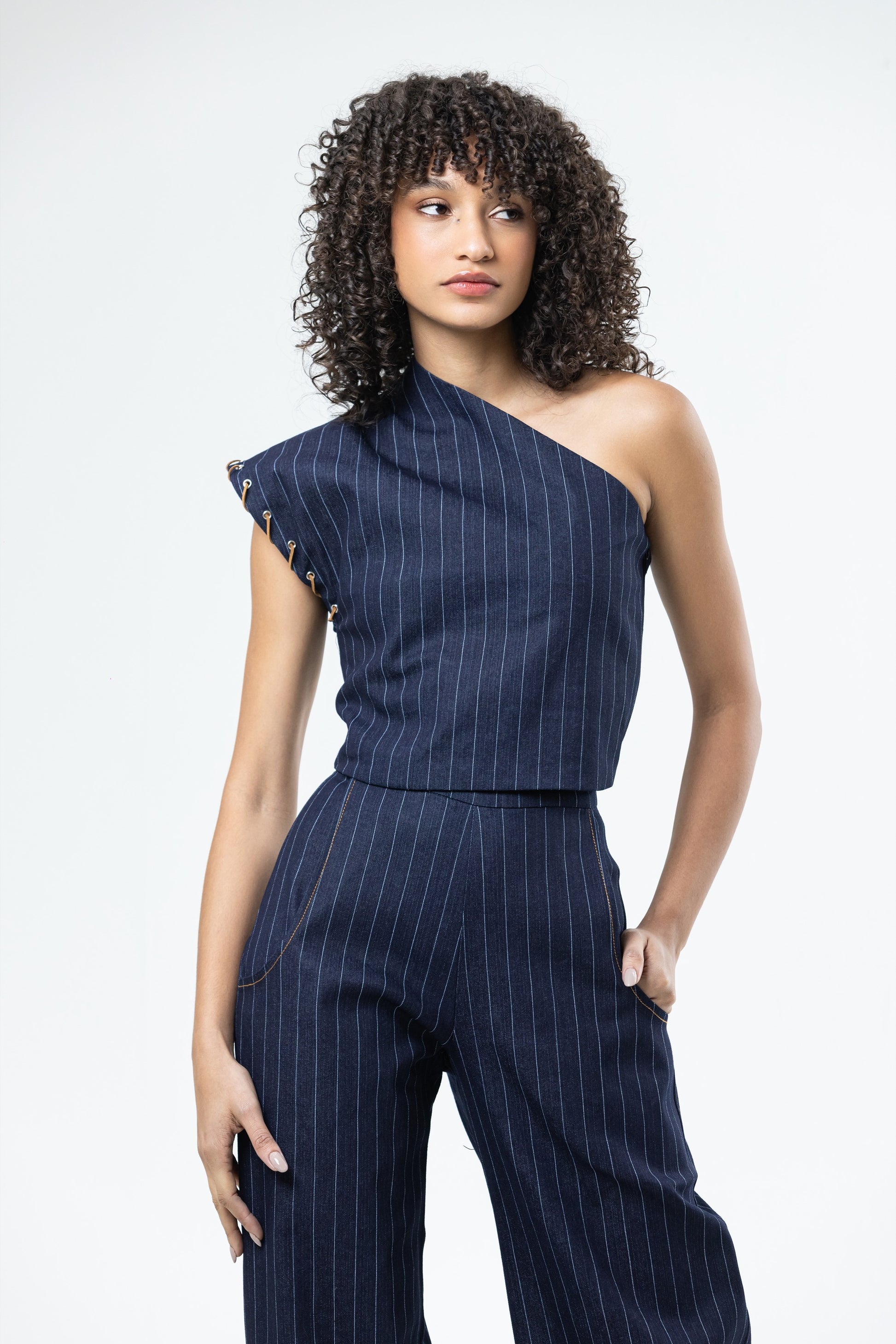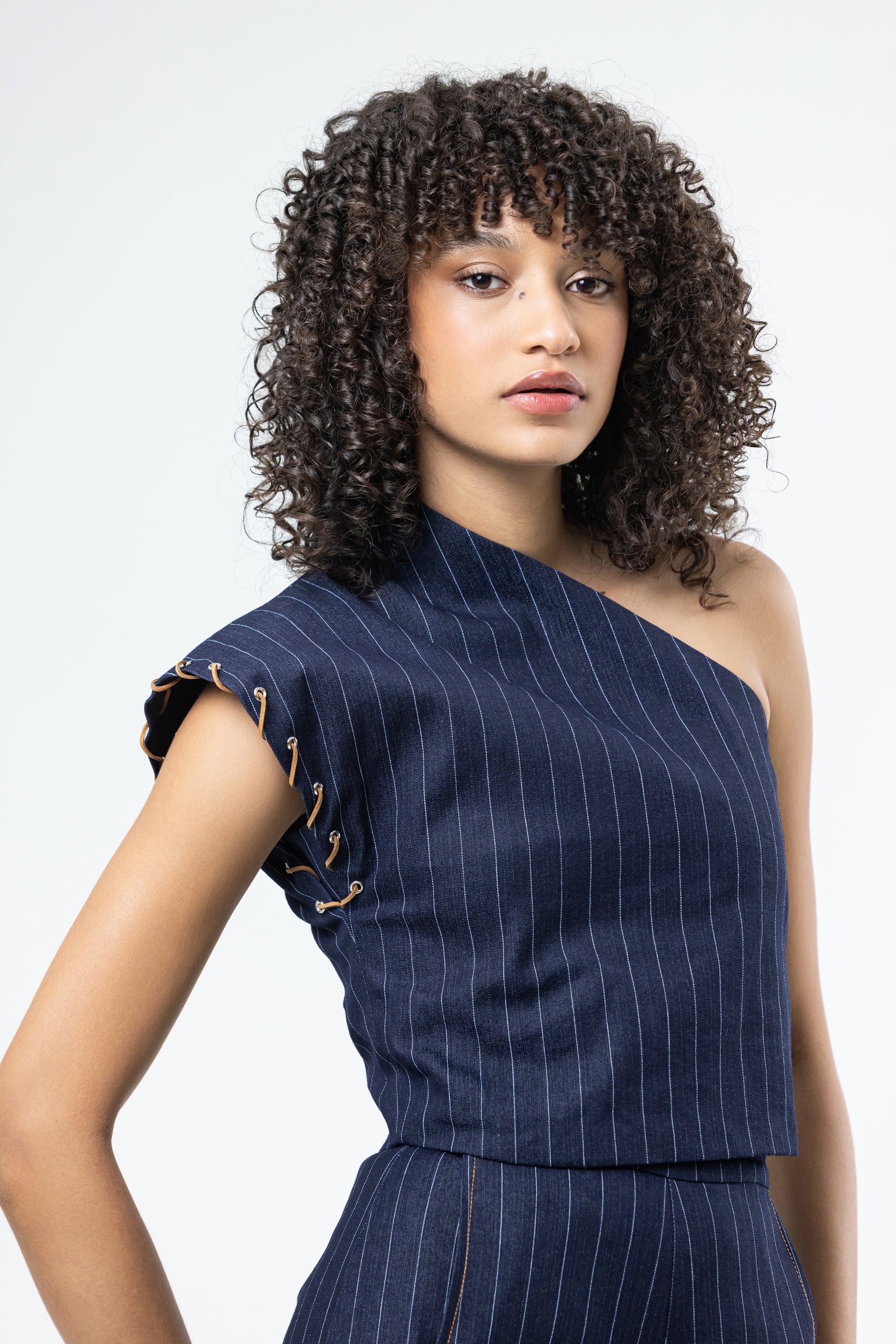 Top de un hombro y ziper separable con detalles de ojaletes en el hombro y cordon de cuero vero.